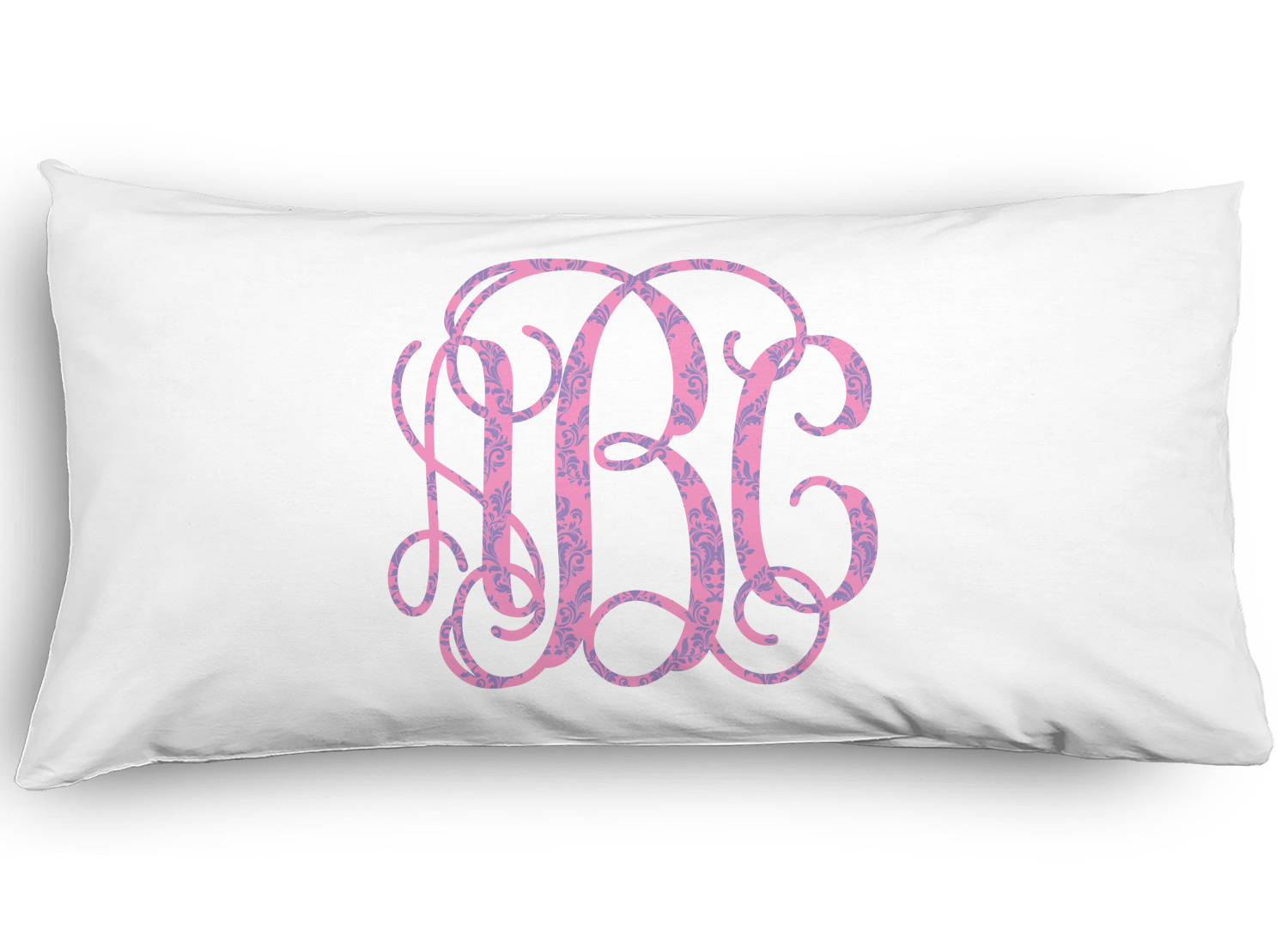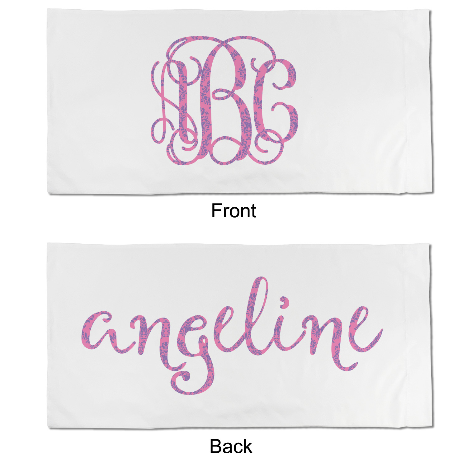 This stunning design is very feminine and elegant. It has simple, yet classic purple and white stripes on top with the stunningly elegant damask in pink and white on the bottom. The design is trimmed with a classic purple ribbon, along with a scalloped label and ever so beautiful interlocking monogram.