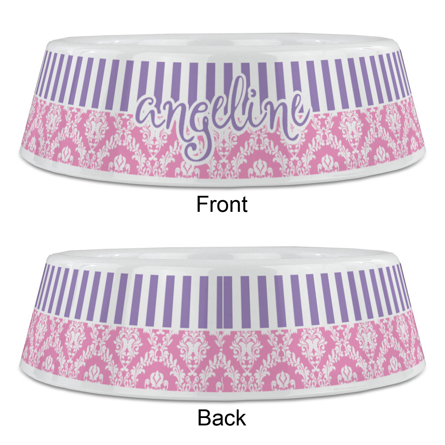 This stunning design is very feminine and elegant. It has simple, yet classic purple and white stripes on top with the stunningly elegant damask in pink and white on the bottom. The design is trimmed with a classic purple ribbon, along with a scalloped label and ever so beautiful interlocking monogram.