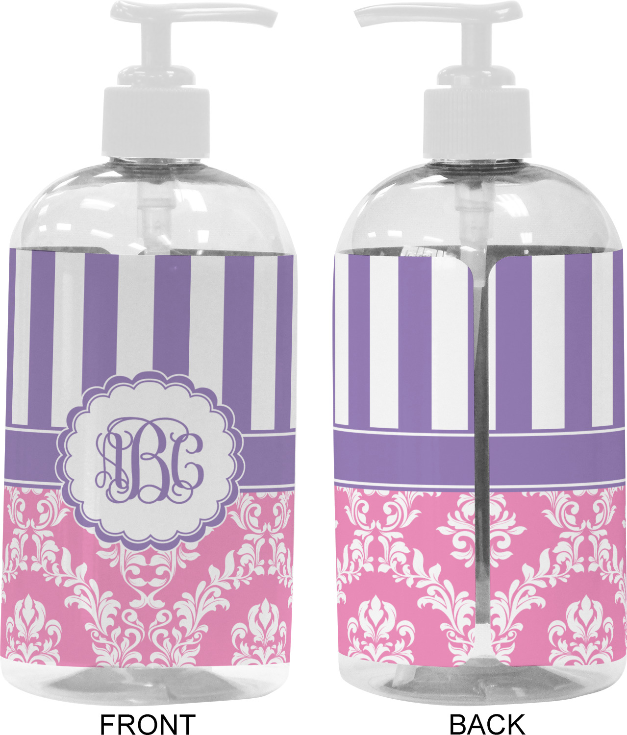This stunning design is very feminine and elegant. It has simple, yet classic purple and white stripes on top with the stunningly elegant damask in pink and white on the bottom. The design is trimmed with a classic purple ribbon, along with a scalloped label and ever so beautiful interlocking monogram.