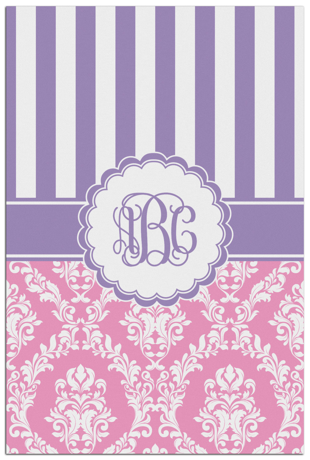 This stunning design is very feminine and elegant. It has simple, yet classic purple and white stripes on top with the stunningly elegant damask in pink and white on the bottom. The design is trimmed with a classic purple ribbon, along with a scalloped label and ever so beautiful interlocking monogram.