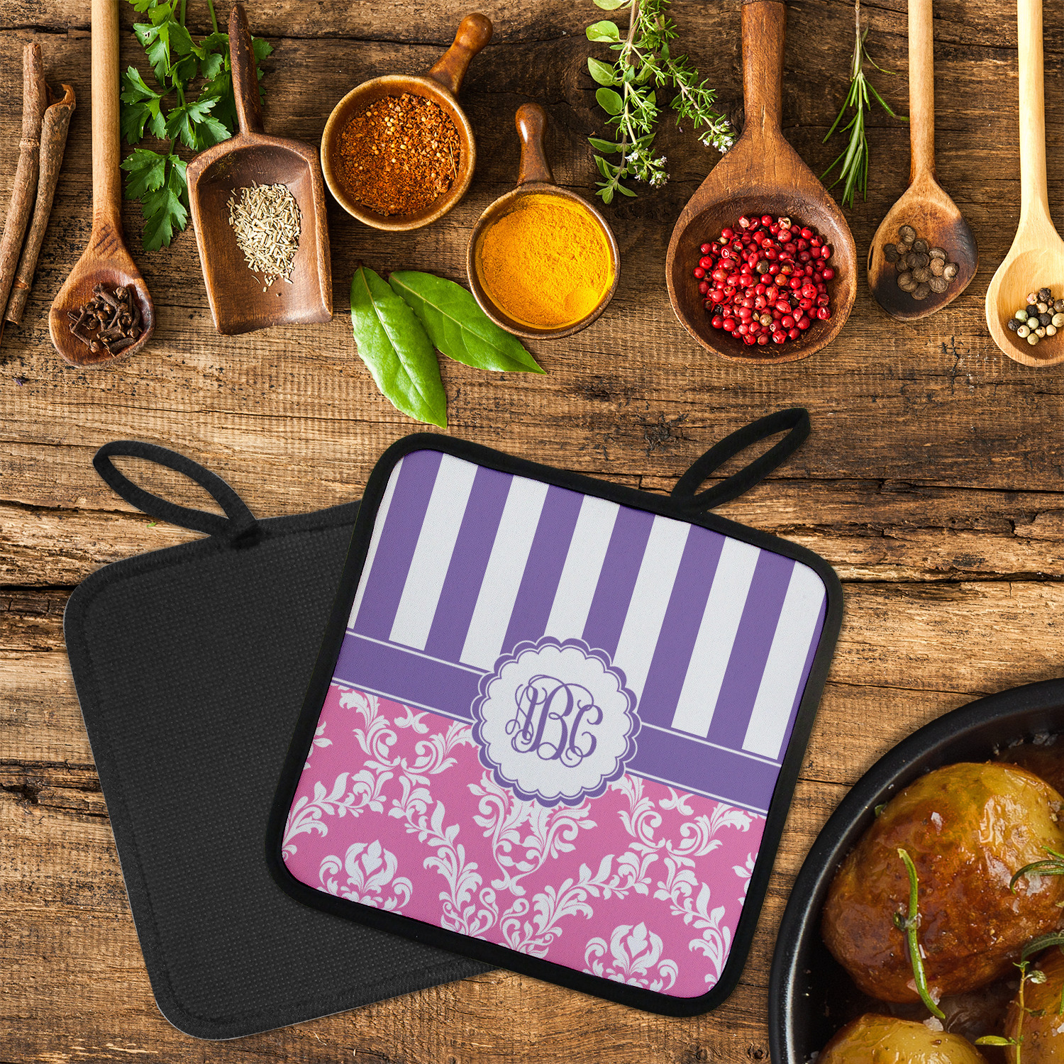 Our personalized pot holders feature a neoprene front that displays your personalization in vibrant colors. The backing of the hot pot holder is rubberized; the textured backing allows you to have a great grip when using this custom pot holder. The two materials are joined with a sleek, black trim, and the holder also includes an attached loop for hanging and storage. The pot holder is approximately 8.75 inches by 8.75 inches and 0.25 inches tall, while the fabric loop is 2.5 inches long. You can purchase a kitchen pot holder by itself or as a set of 2. We also offer a set including one pot holder and one oven mitt.