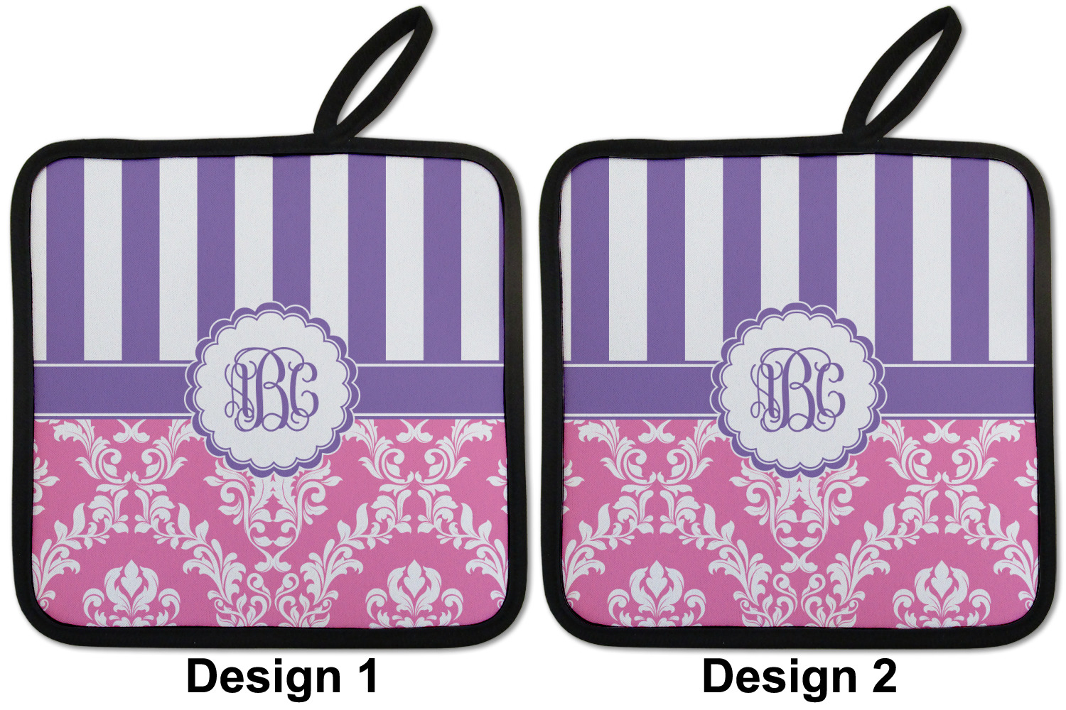 Our personalized pot holders feature a neoprene front that displays your personalization in vibrant colors. The backing of the hot pot holder is rubberized; the textured backing allows you to have a great grip when using this custom pot holder. The two materials are joined with a sleek, black trim, and the holder also includes an attached loop for hanging and storage. The pot holder is approximately 8.75 inches by 8.75 inches and 0.25 inches tall, while the fabric loop is 2.5 inches long. You can purchase a kitchen pot holder by itself or as a set of 2. We also offer a set including one pot holder and one oven mitt.