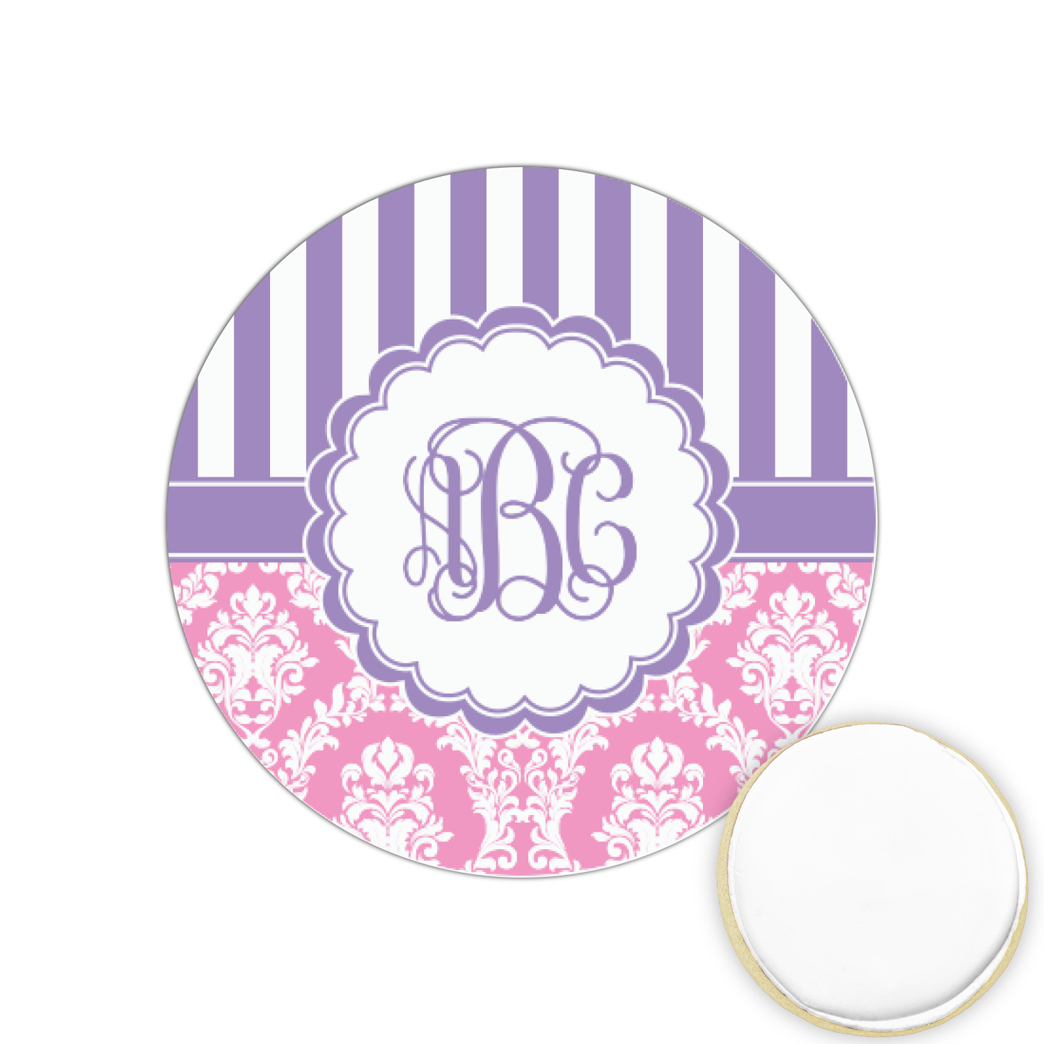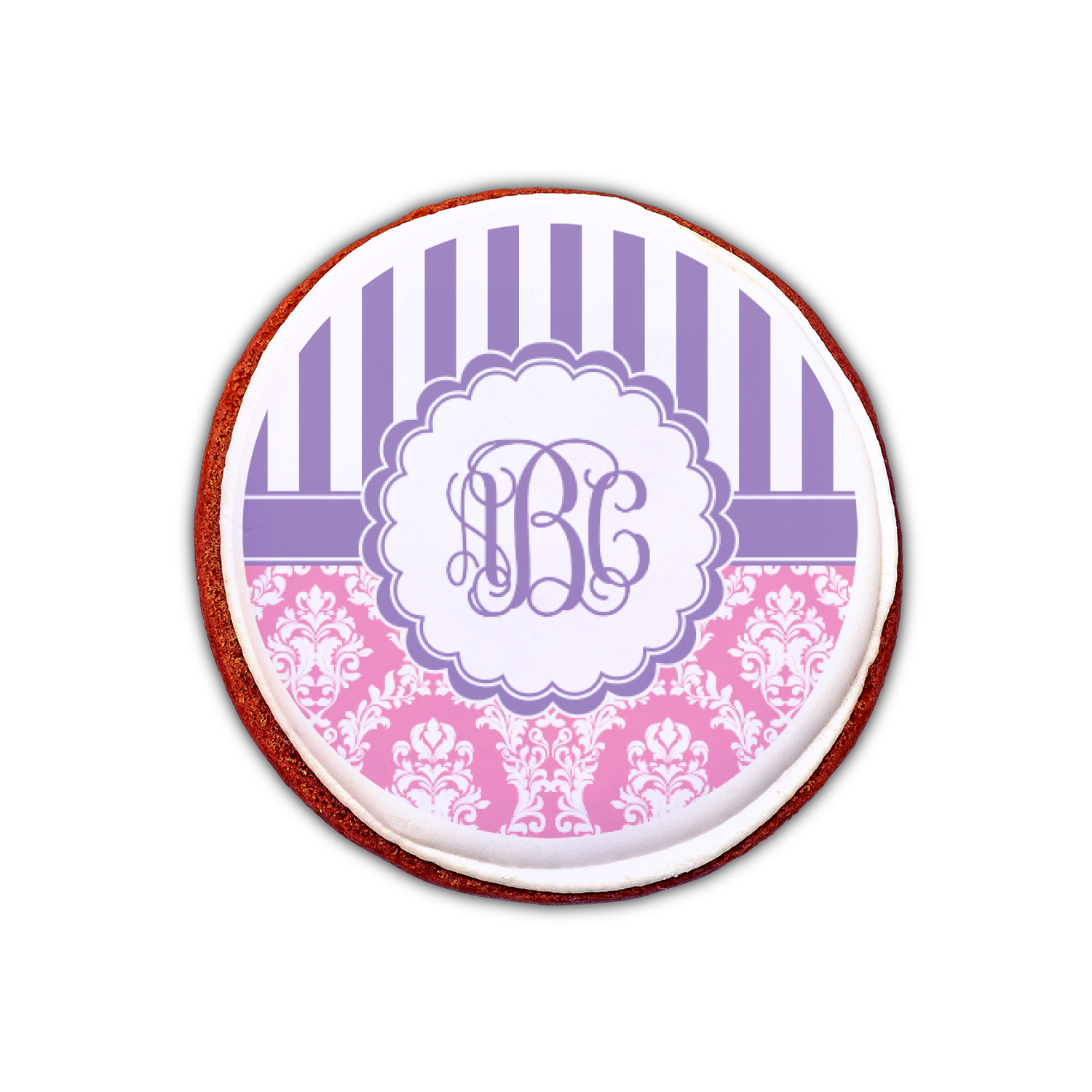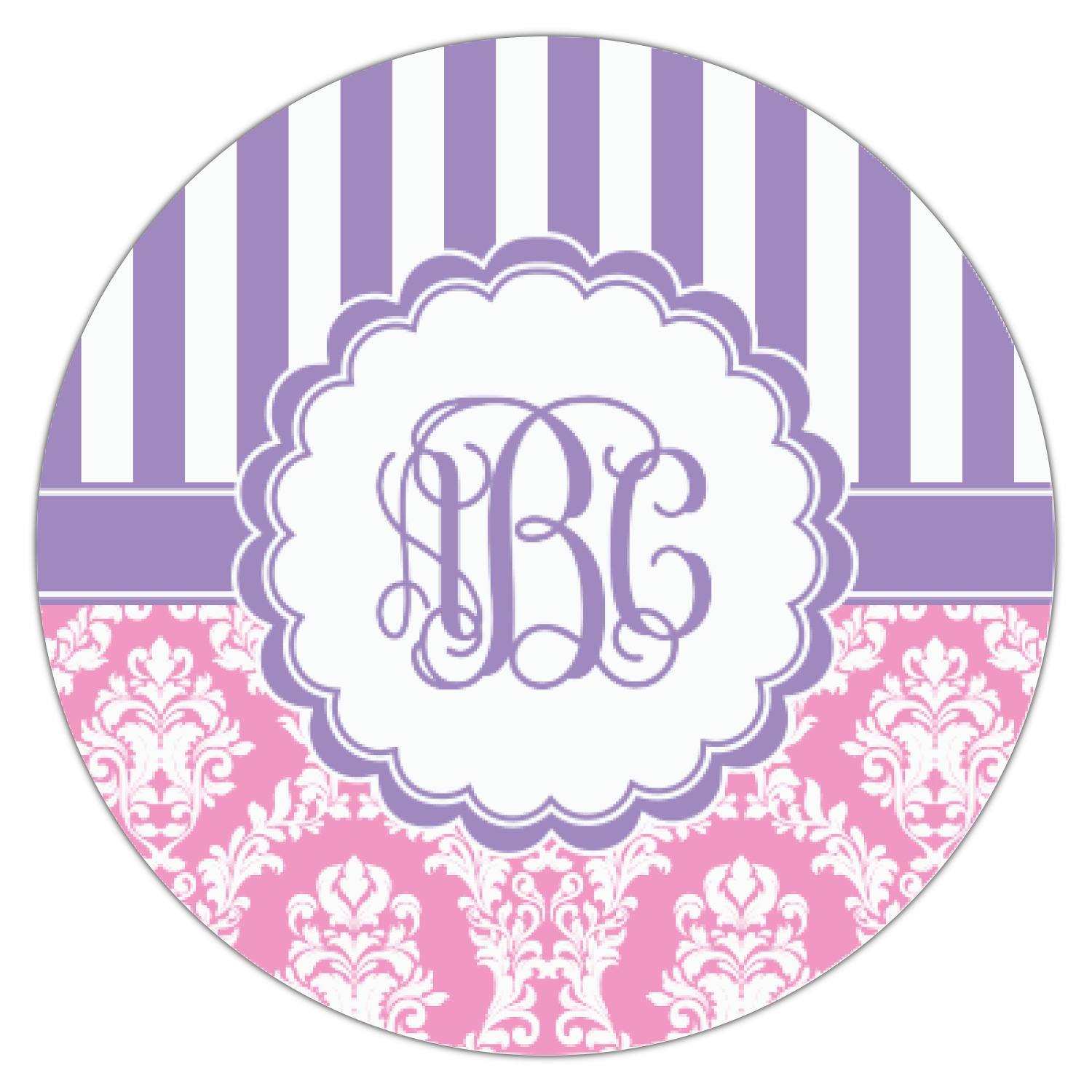 This stunning design is very feminine and elegant. It has simple, yet classic purple and white stripes on top with the stunningly elegant damask in pink and white on the bottom. The design is trimmed with a classic purple ribbon, along with a scalloped label and ever so beautiful interlocking monogram.