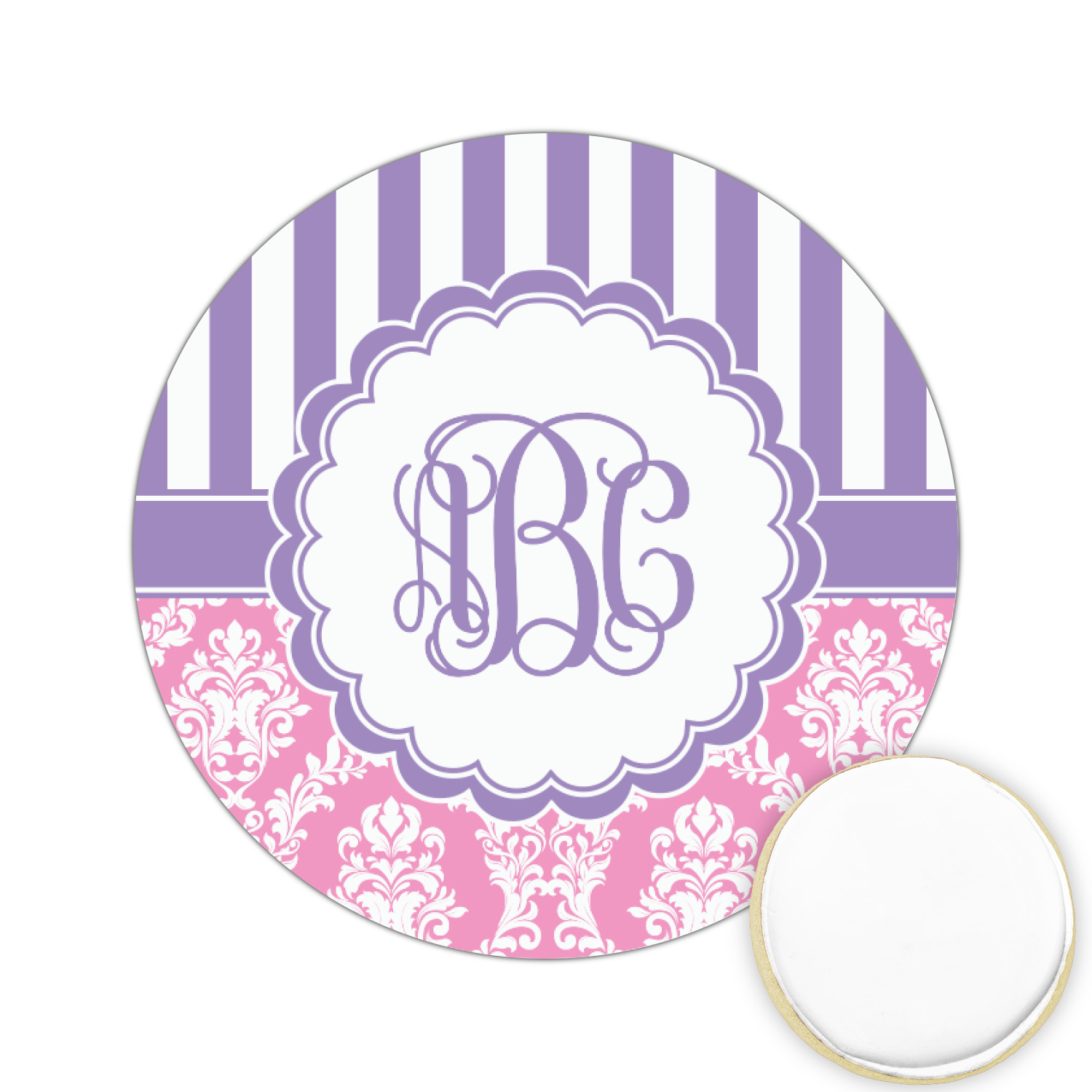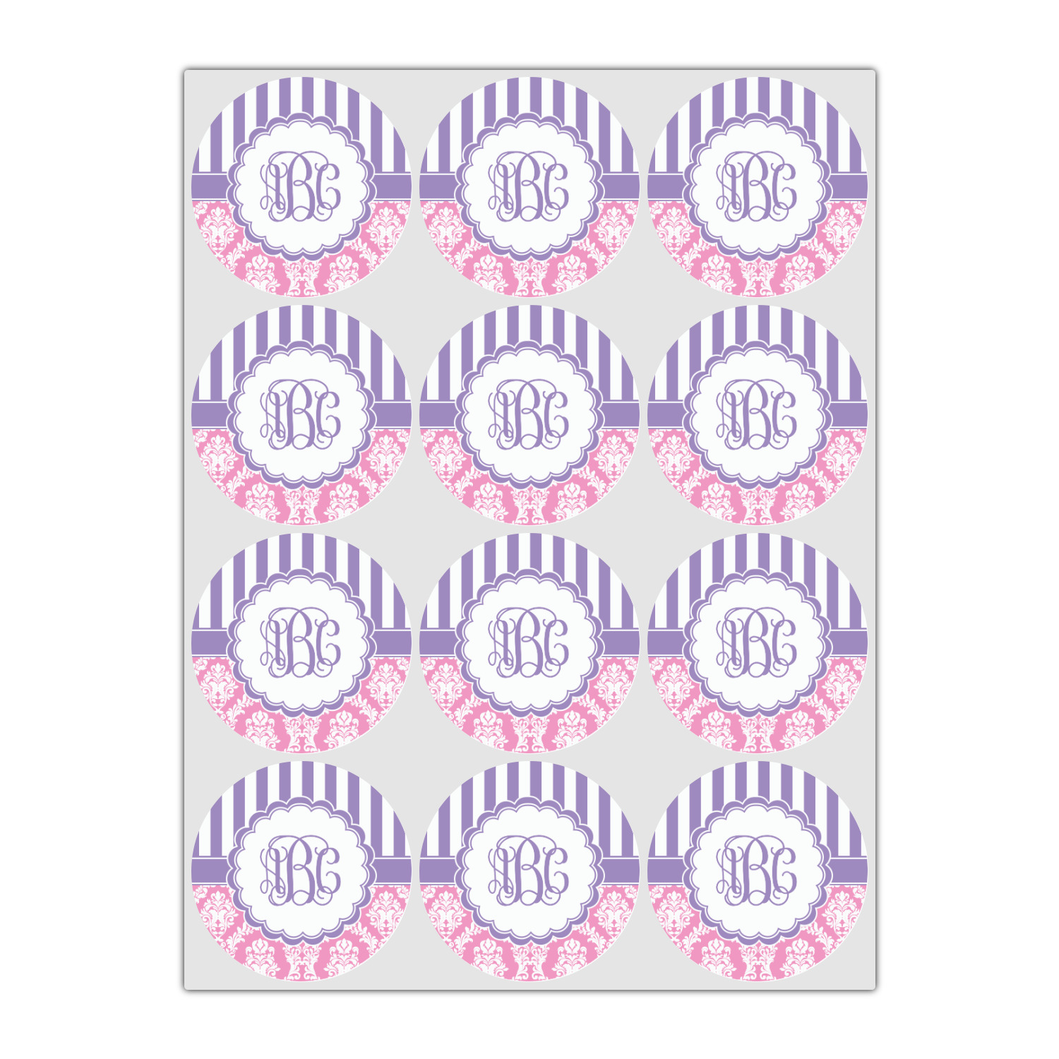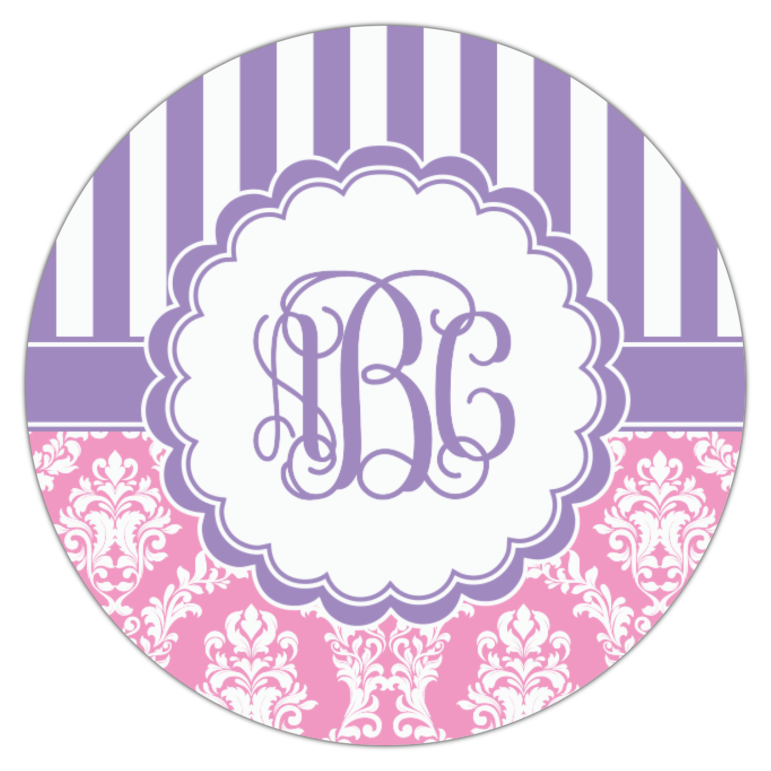 This stunning design is very feminine and elegant. It has simple, yet classic purple and white stripes on top with the stunningly elegant damask in pink and white on the bottom. The design is trimmed with a classic purple ribbon, along with a scalloped label and ever so beautiful interlocking monogram.