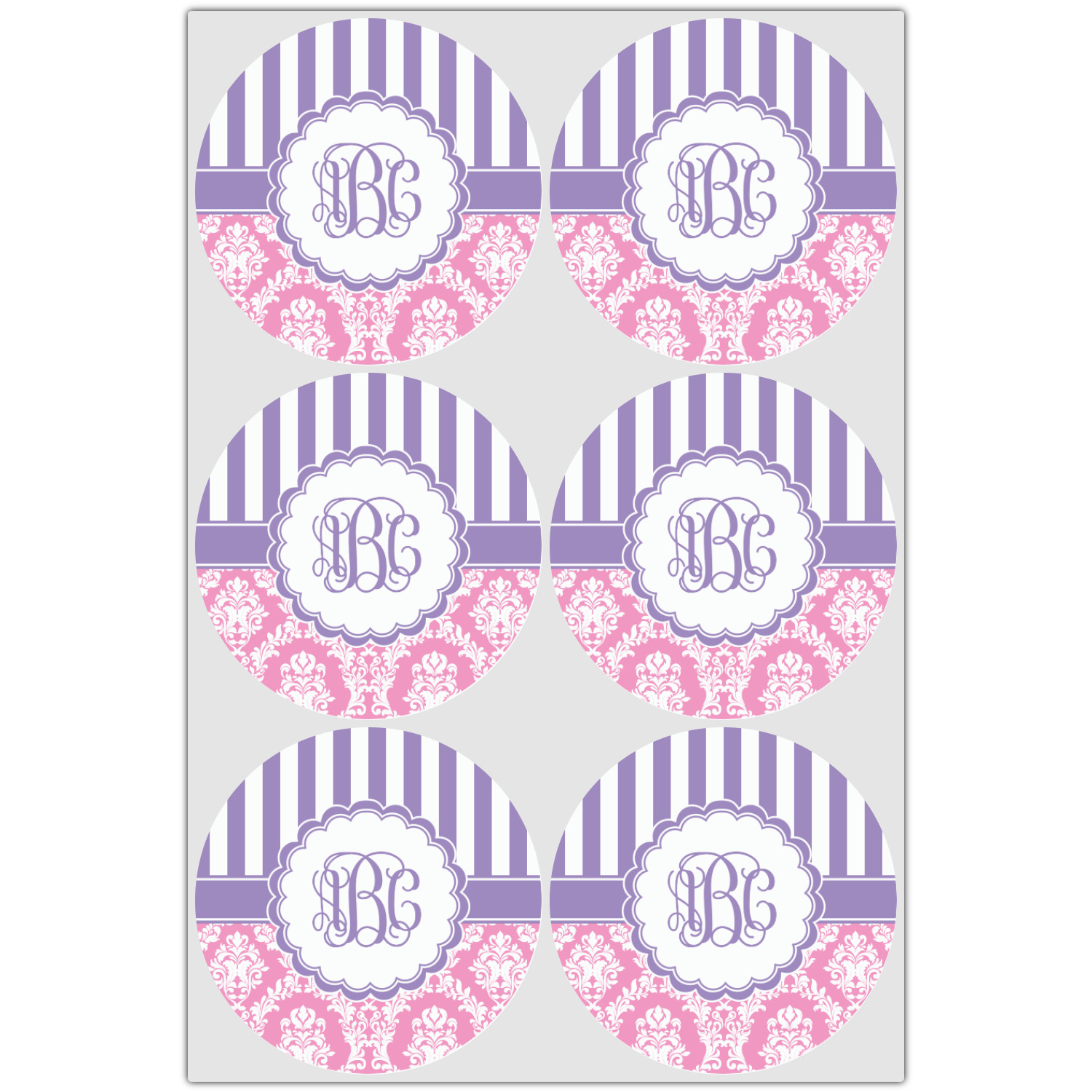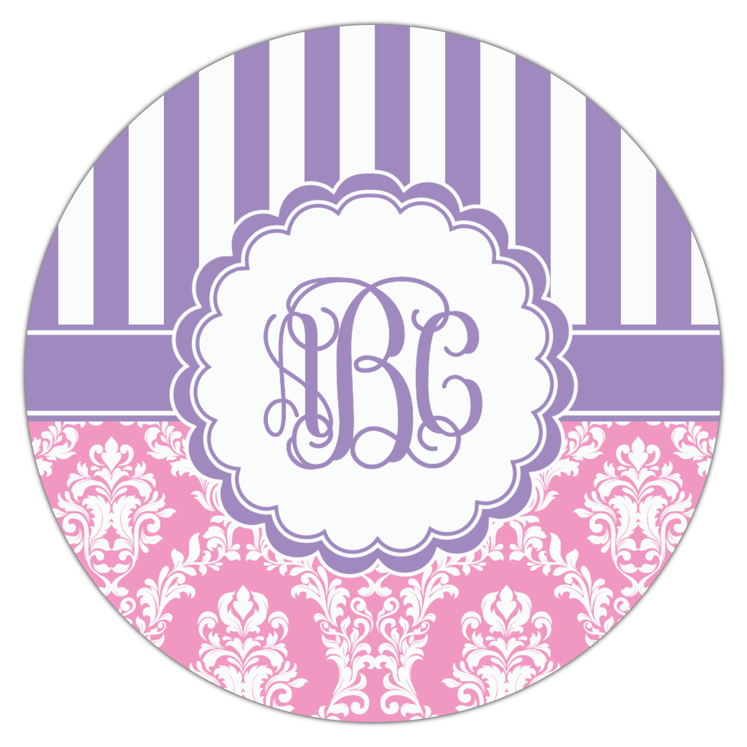 This stunning design is very feminine and elegant. It has simple, yet classic purple and white stripes on top with the stunningly elegant damask in pink and white on the bottom. The design is trimmed with a classic purple ribbon, along with a scalloped label and ever so beautiful interlocking monogram.