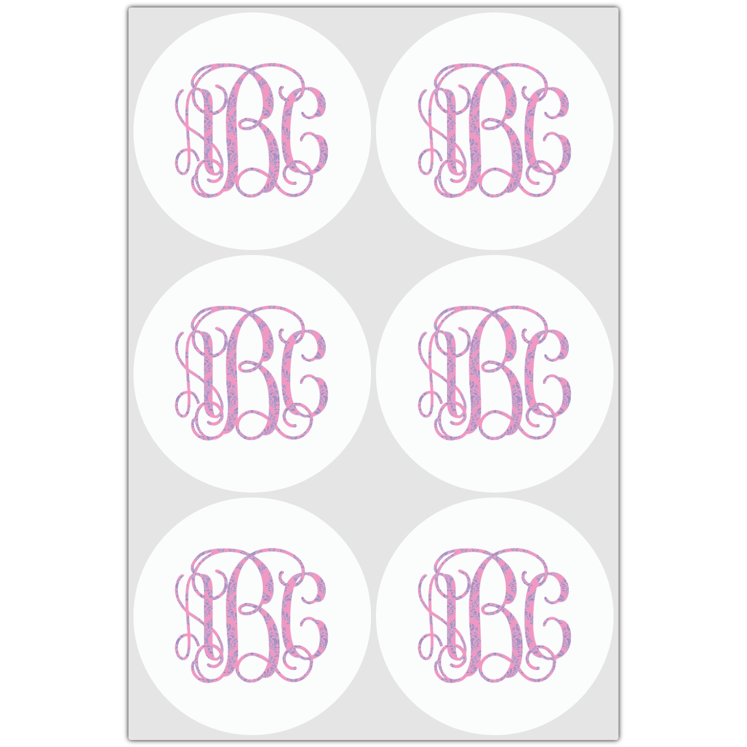 This stunning design is very feminine and elegant. It has simple, yet classic purple and white stripes on top with the stunningly elegant damask in pink and white on the bottom. The design is trimmed with a classic purple ribbon, along with a scalloped label and ever so beautiful interlocking monogram.