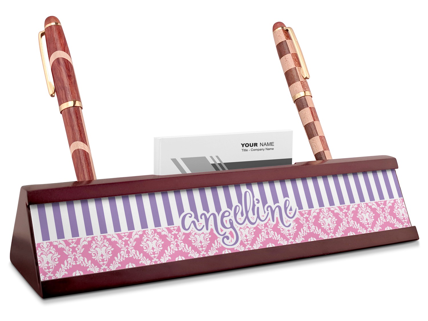 Your desk name plates are crafted from a high-quality, dark-cherry mahogany. At approximately 9.5 by 1.875 by 2.5 inches, this name plaque will fit perfectly, front and center, on your desk. Your customization spans across the entire face of the nameplate. Behind the nameplate lies a skinny slot that can fit approximately 15, traditionally-sized, business cards. You can also store your writing utensils on either side of this custom desk name plate.