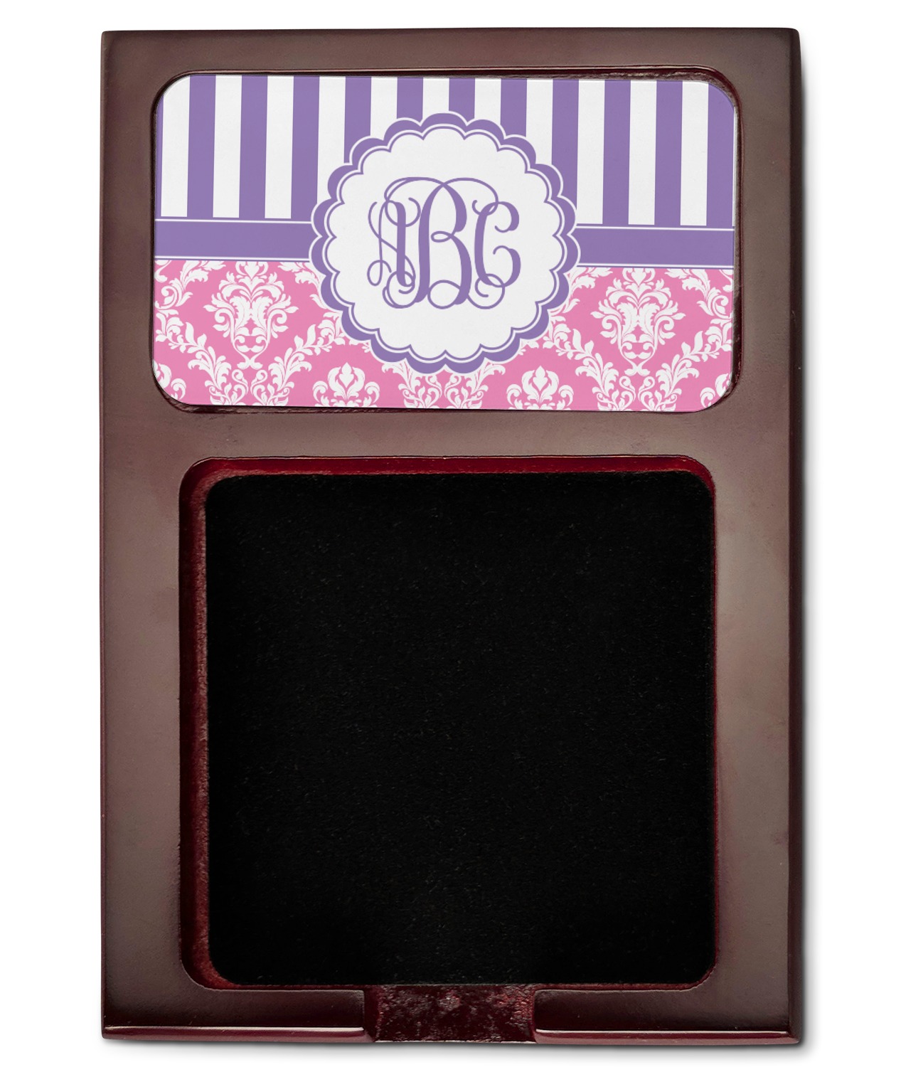 Crafted from a fine mahogany, this post it note holder is in the shade of a dark, cherry color. The dispenser itself is about 4.25 by 6.25 by 0.75 inches. You can place your 3 by 3 inch sticky notes in the indentation below the nameplate. We print your customization onto the nameplate that rests above the velvety indentation.