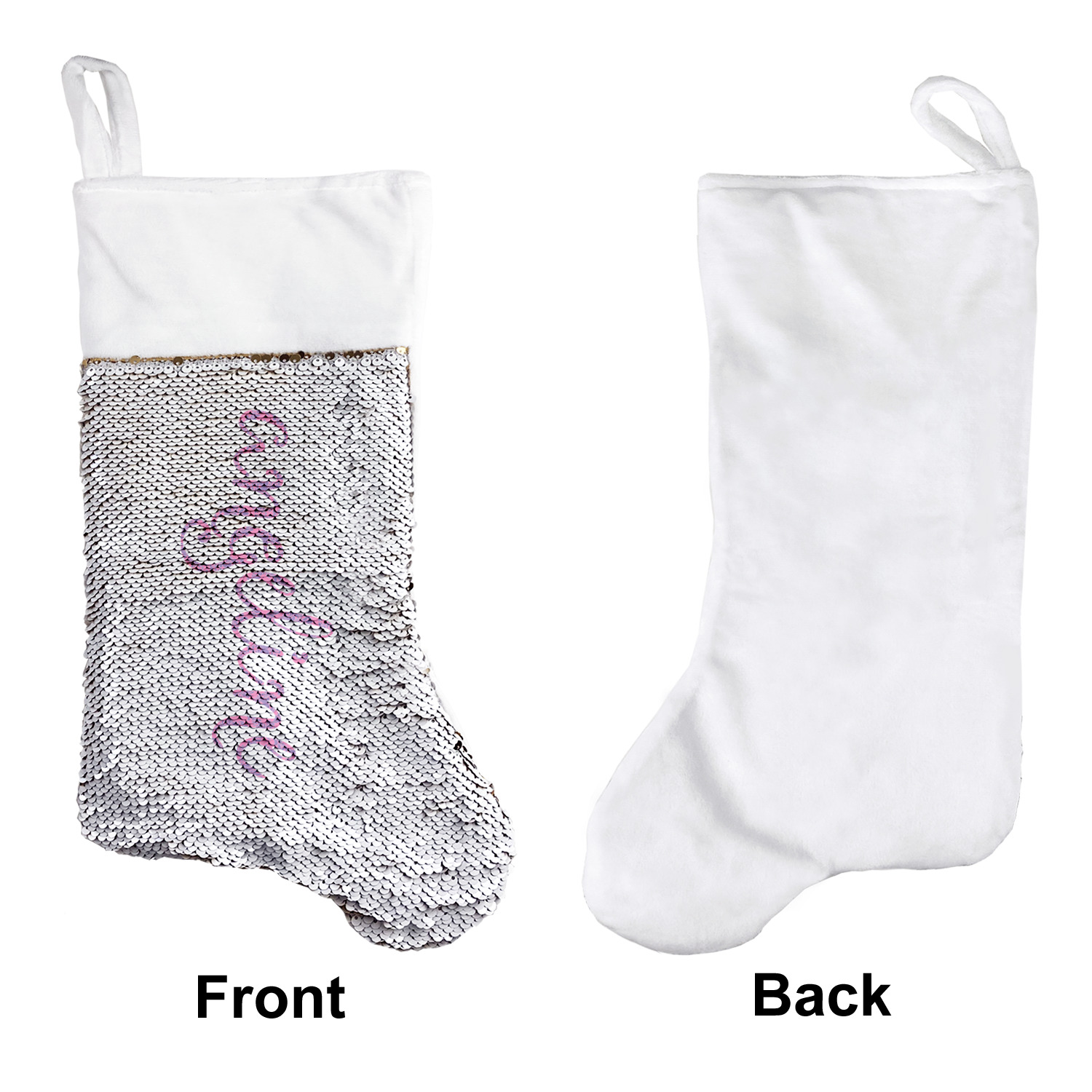 Our fun sequin stockings are made from a soft, yet durable polyester material perfect for any stocking stuffer or holiday decor! Choose from a glamorous gold stocking or classic red sequin stocking for the front color and have your personalized image printed behind for reversible fun! Our sparkly sequin stockings are super fun and decorative perfect for the family and you this holiday! Each stocking is approximately 17" x 9" with a durable loop for hanging and printed here in the US.