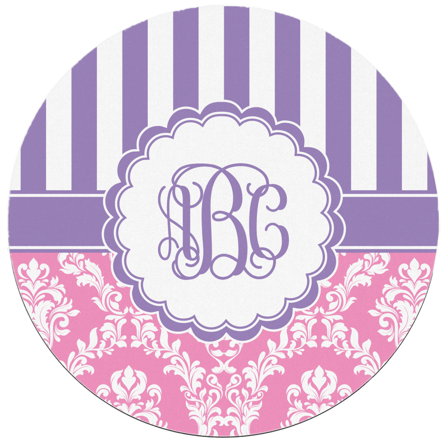 This stunning design is very feminine and elegant. It has simple, yet classic purple and white stripes on top with the stunningly elegant damask in pink and white on the bottom. The design is trimmed with a classic purple ribbon, along with a scalloped label and ever so beautiful interlocking monogram.