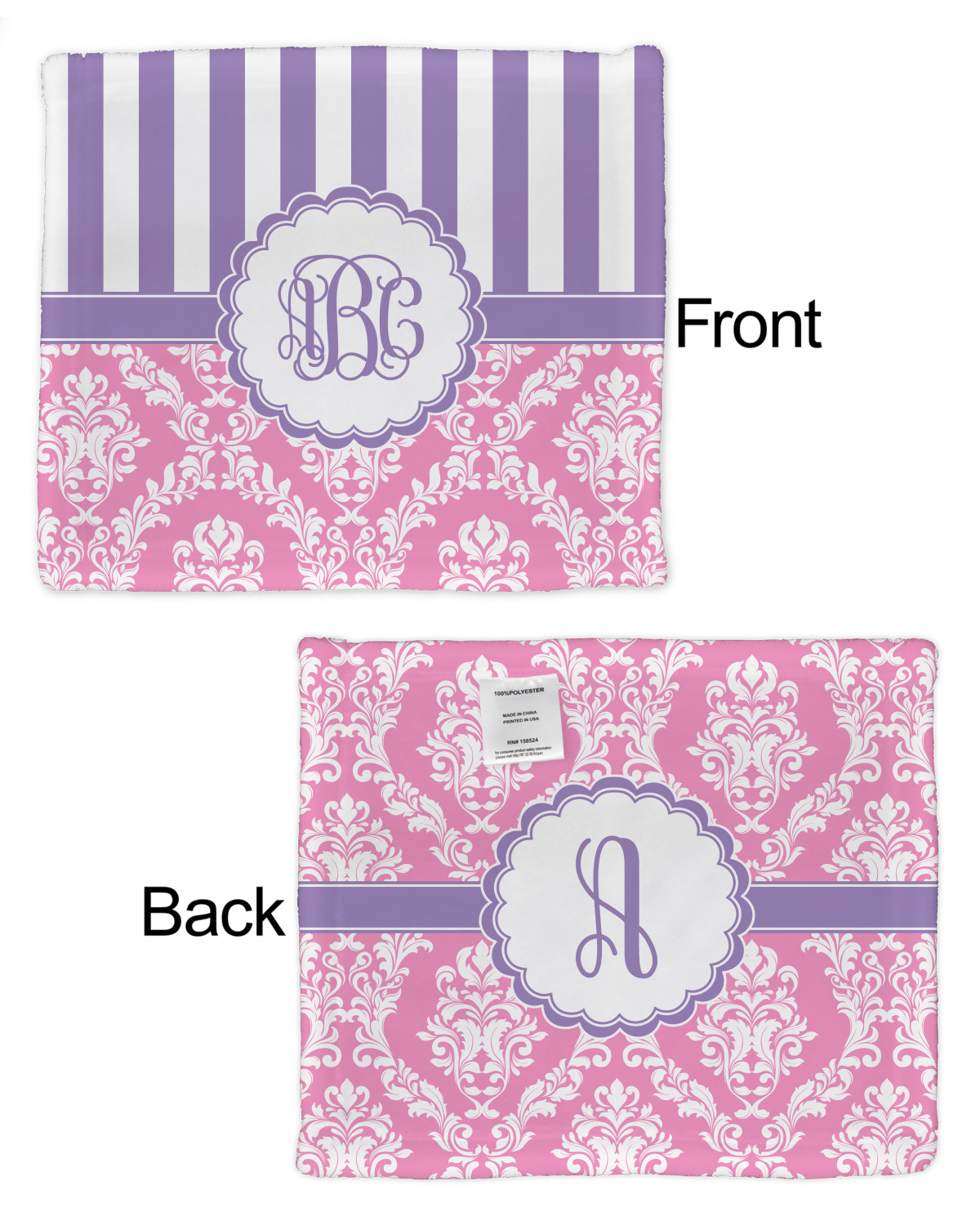 This stunning design is very feminine and elegant. It has simple, yet classic purple and white stripes on top with the stunningly elegant damask in pink and white on the bottom. The design is trimmed with a classic purple ribbon, along with a scalloped label and ever so beautiful interlocking monogram.