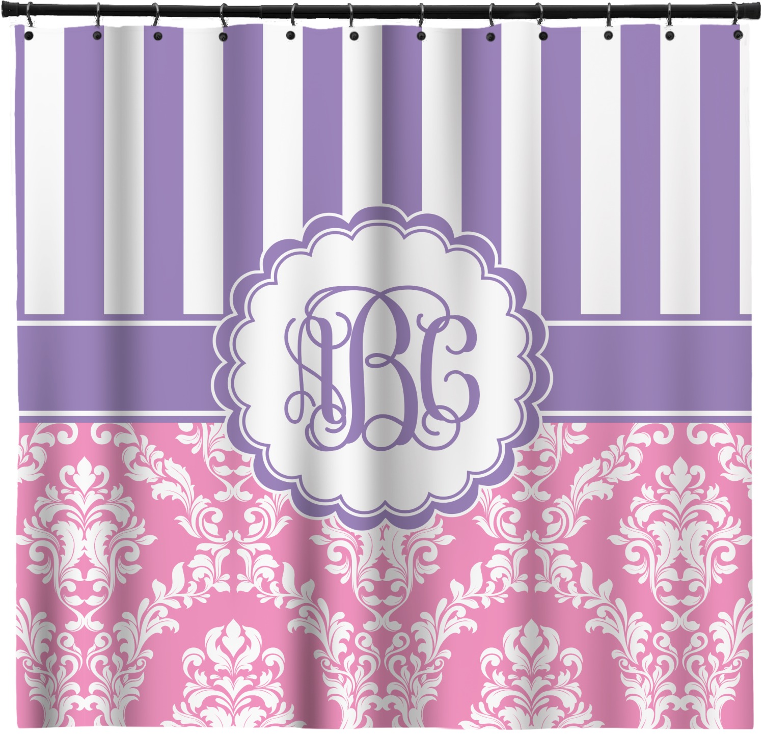 This stunning design is very feminine and elegant. It has simple, yet classic purple and white stripes on top with the stunningly elegant damask in pink and white on the bottom. The design is trimmed with a classic purple ribbon, along with a scalloped label and ever so beautiful interlocking monogram.