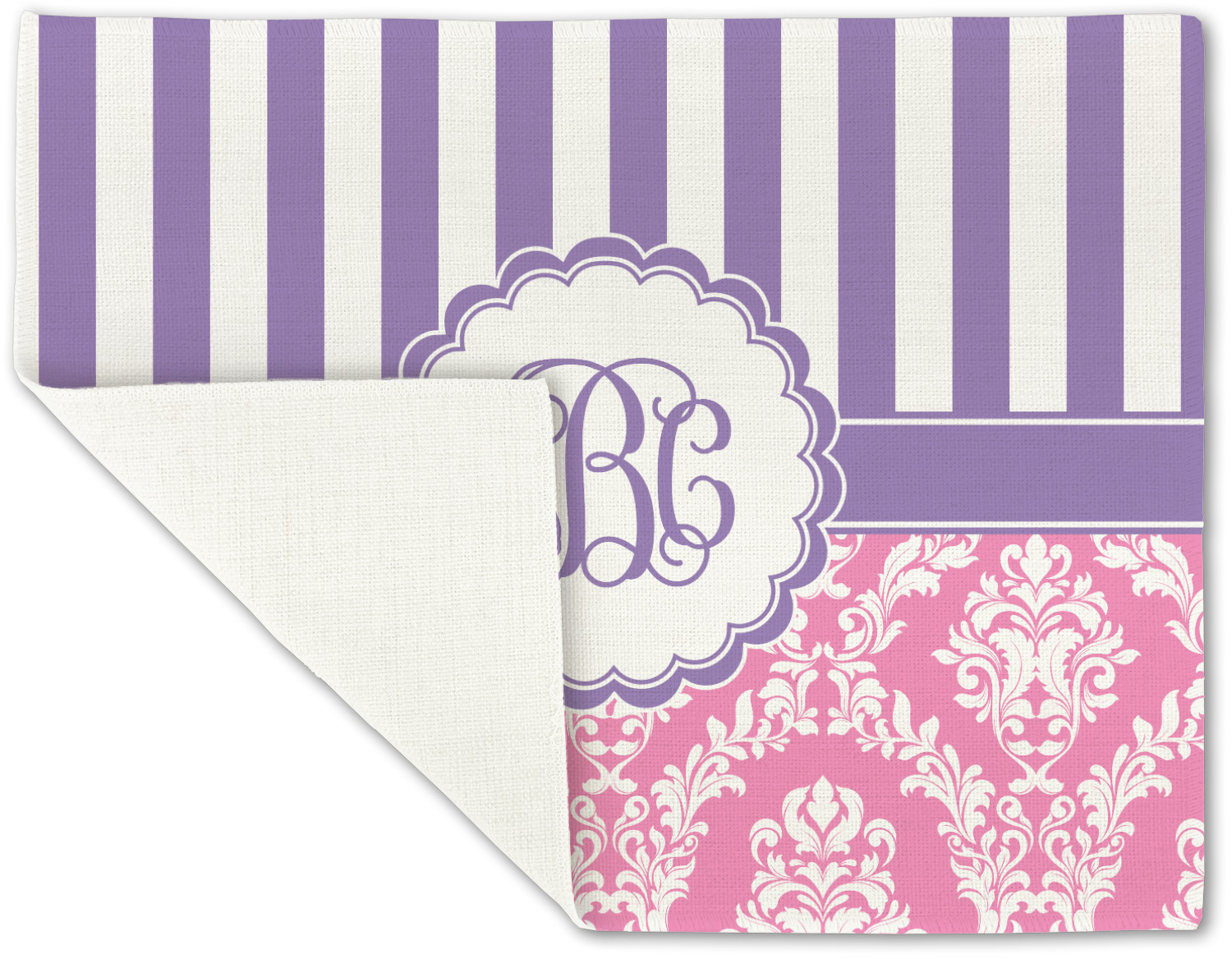 This stunning design is very feminine and elegant. It has simple, yet classic purple and white stripes on top with the stunningly elegant damask in pink and white on the bottom. The design is trimmed with a classic purple ribbon, along with a scalloped label and ever so beautiful interlocking monogram.