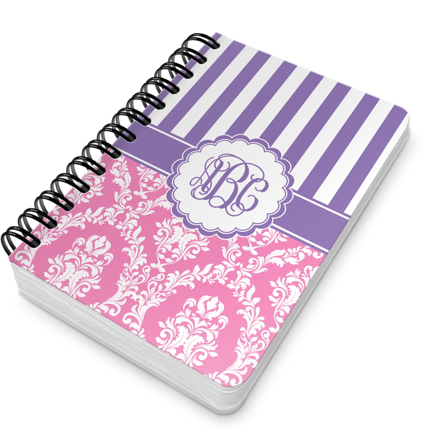 This spiral notebook includes 75 sheets of thick, ruled paper. The front and back of this custom notebook is made of a robust, laminate, plastic covering. We print your personalization on these two panels, underneath a glossy finish, which emphasizes the colors of your design. The two panels and the sheets of paper are held together by a sturdy, black coil. The paper within your bound notebook is perforated for easy, clean tearing.