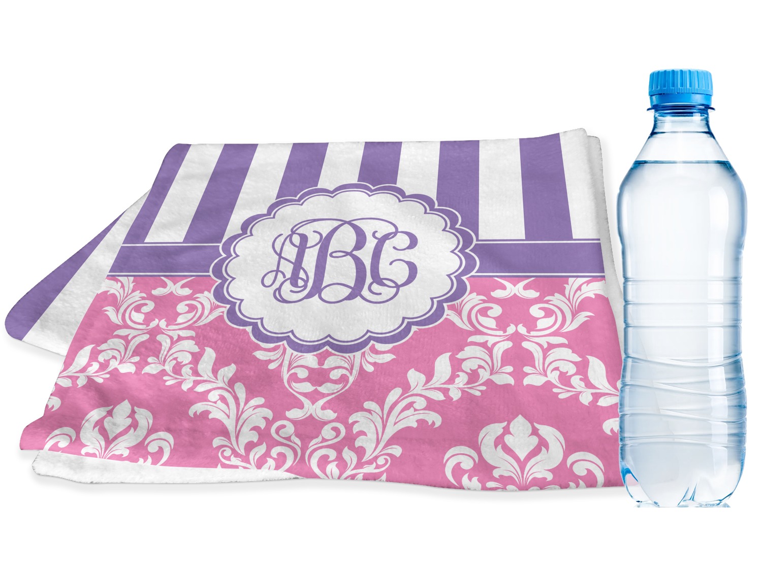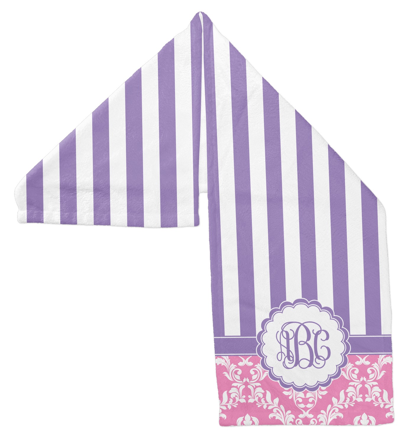 This stunning design is very feminine and elegant. It has simple, yet classic purple and white stripes on top with the stunningly elegant damask in pink and white on the bottom. The design is trimmed with a classic purple ribbon, along with a scalloped label and ever so beautiful interlocking monogram.