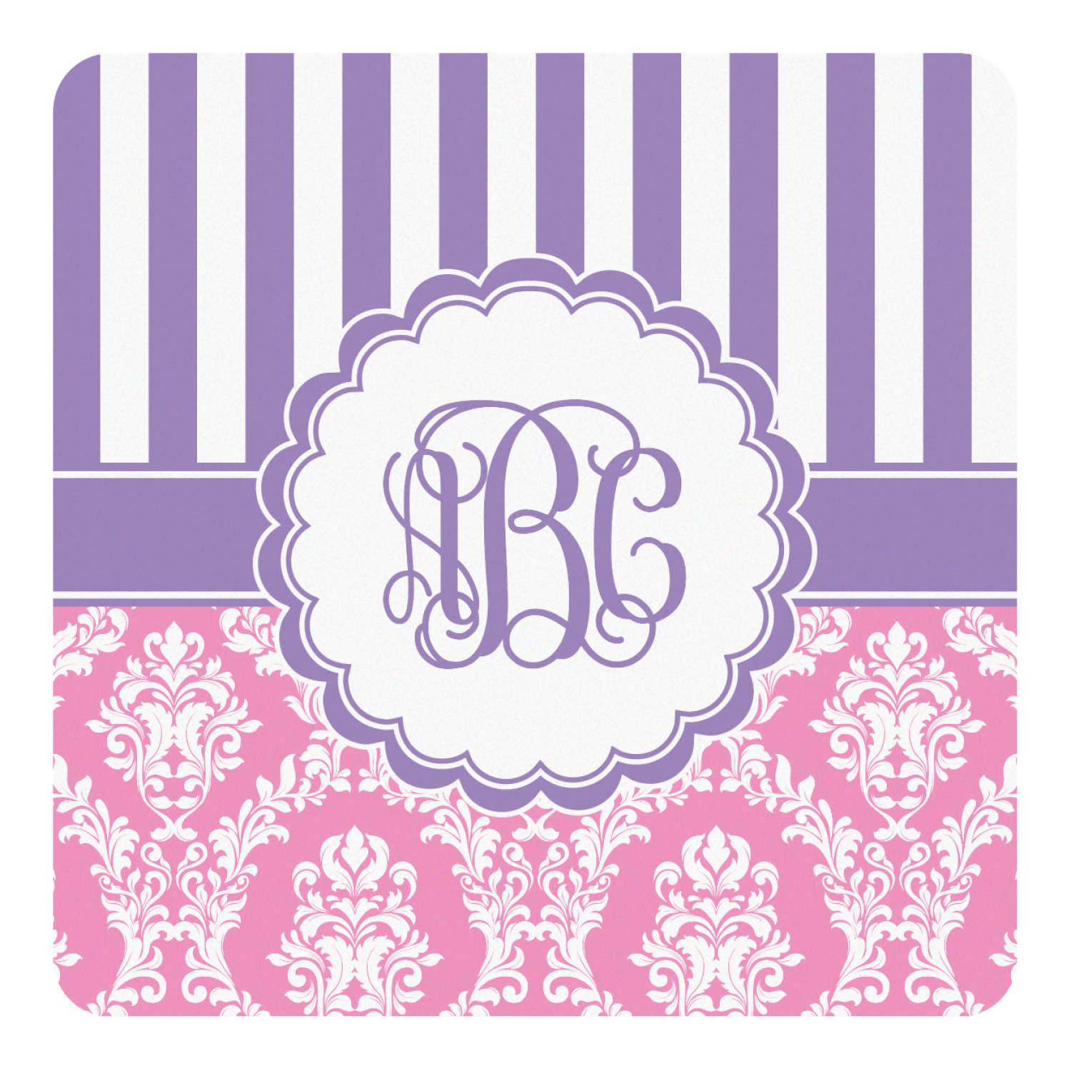 This stunning design is very feminine and elegant. It has simple, yet classic purple and white stripes on top with the stunningly elegant damask in pink and white on the bottom. The design is trimmed with a classic purple ribbon, along with a scalloped label and ever so beautiful interlocking monogram.