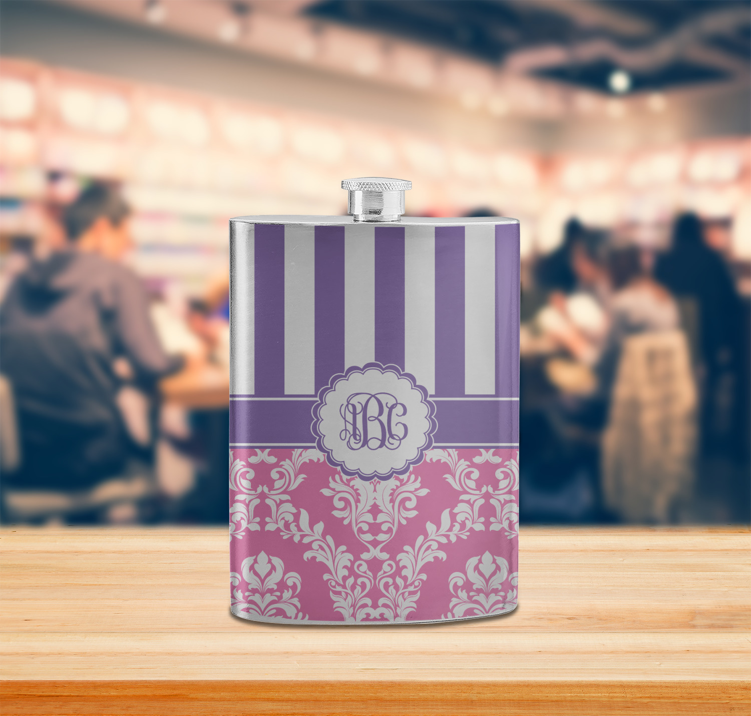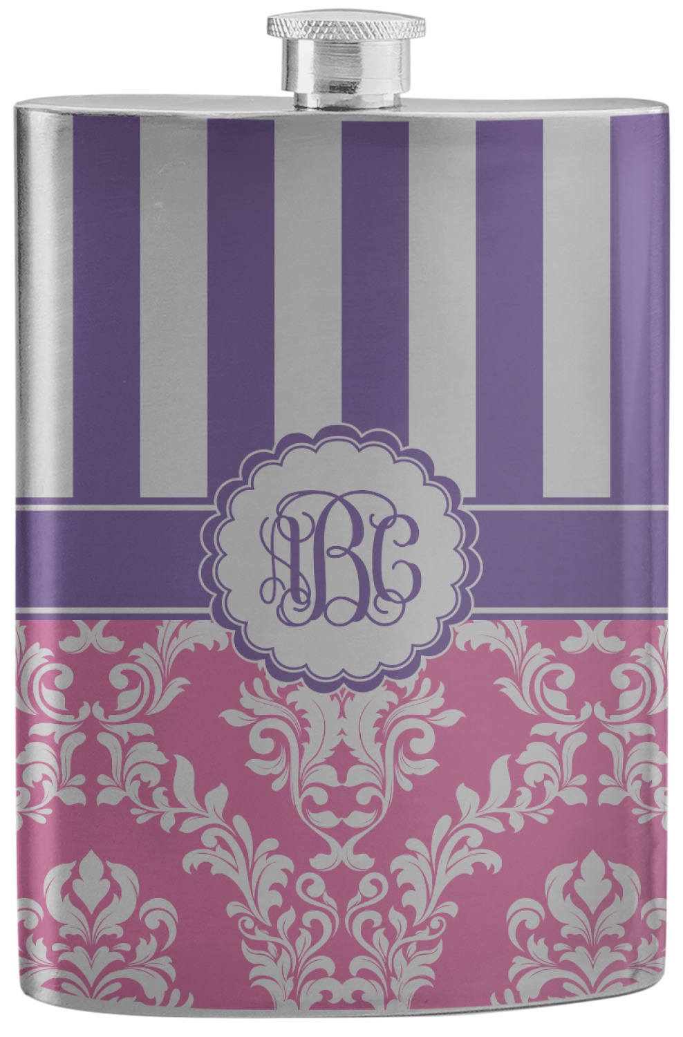 This stunning design is very feminine and elegant. It has simple, yet classic purple and white stripes on top with the stunningly elegant damask in pink and white on the bottom. The design is trimmed with a classic purple ribbon, along with a scalloped label and ever so beautiful interlocking monogram.