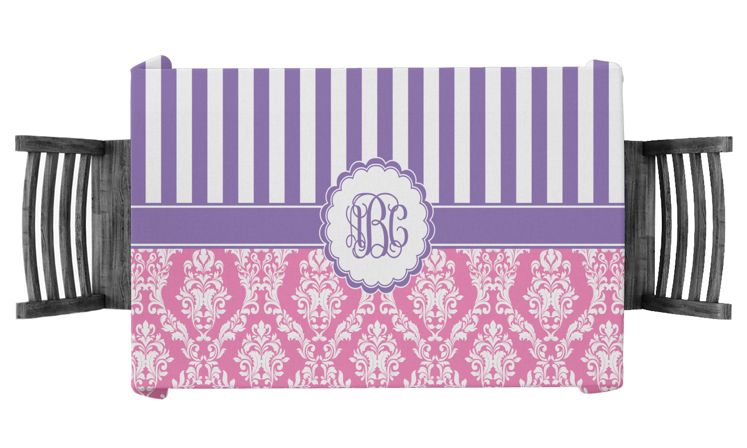 This stunning design is very feminine and elegant. It has simple, yet classic purple and white stripes on top with the stunningly elegant damask in pink and white on the bottom. The design is trimmed with a classic purple ribbon, along with a scalloped label and ever so beautiful interlocking monogram.