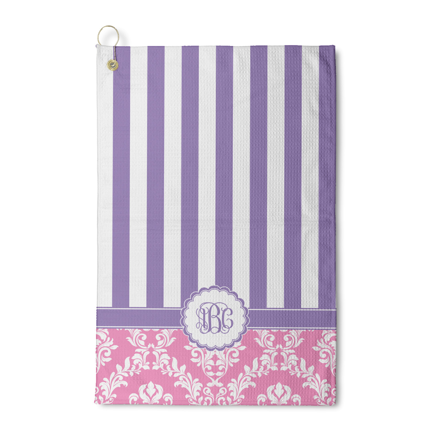 This stunning design is very feminine and elegant. It has simple, yet classic purple and white stripes on top with the stunningly elegant damask in pink and white on the bottom. The design is trimmed with a classic purple ribbon, along with a scalloped label and ever so beautiful interlocking monogram.