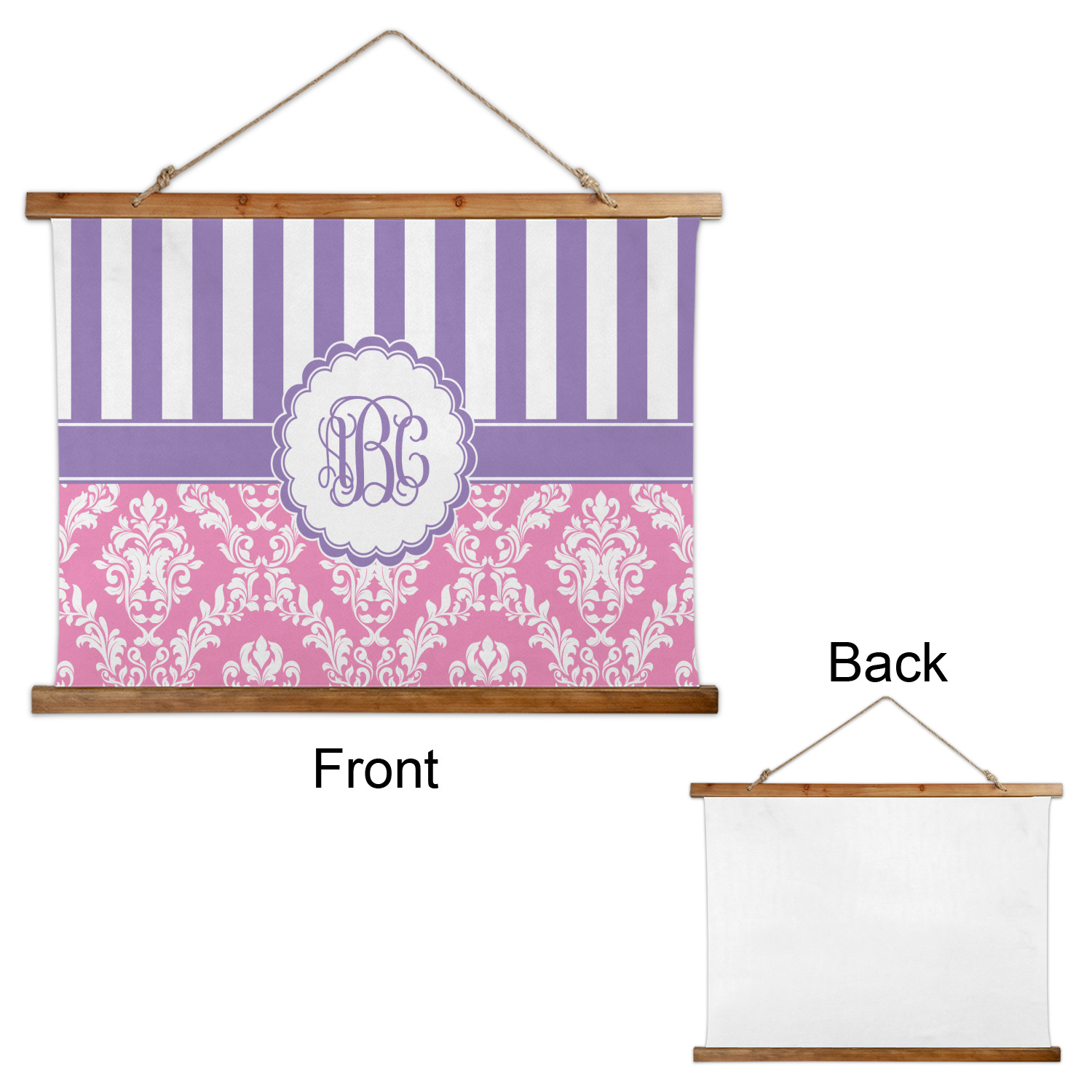 Made in two different orientations - portrait or landscape - both are 26" x 36". Your design is printed on a high quality polyester fabric with hemmed edges. The wood on the top and bottom of the tapestry is 1.25" tall and 0.25" thick and there are two pieces on top and bottom which sandwich the fabric.