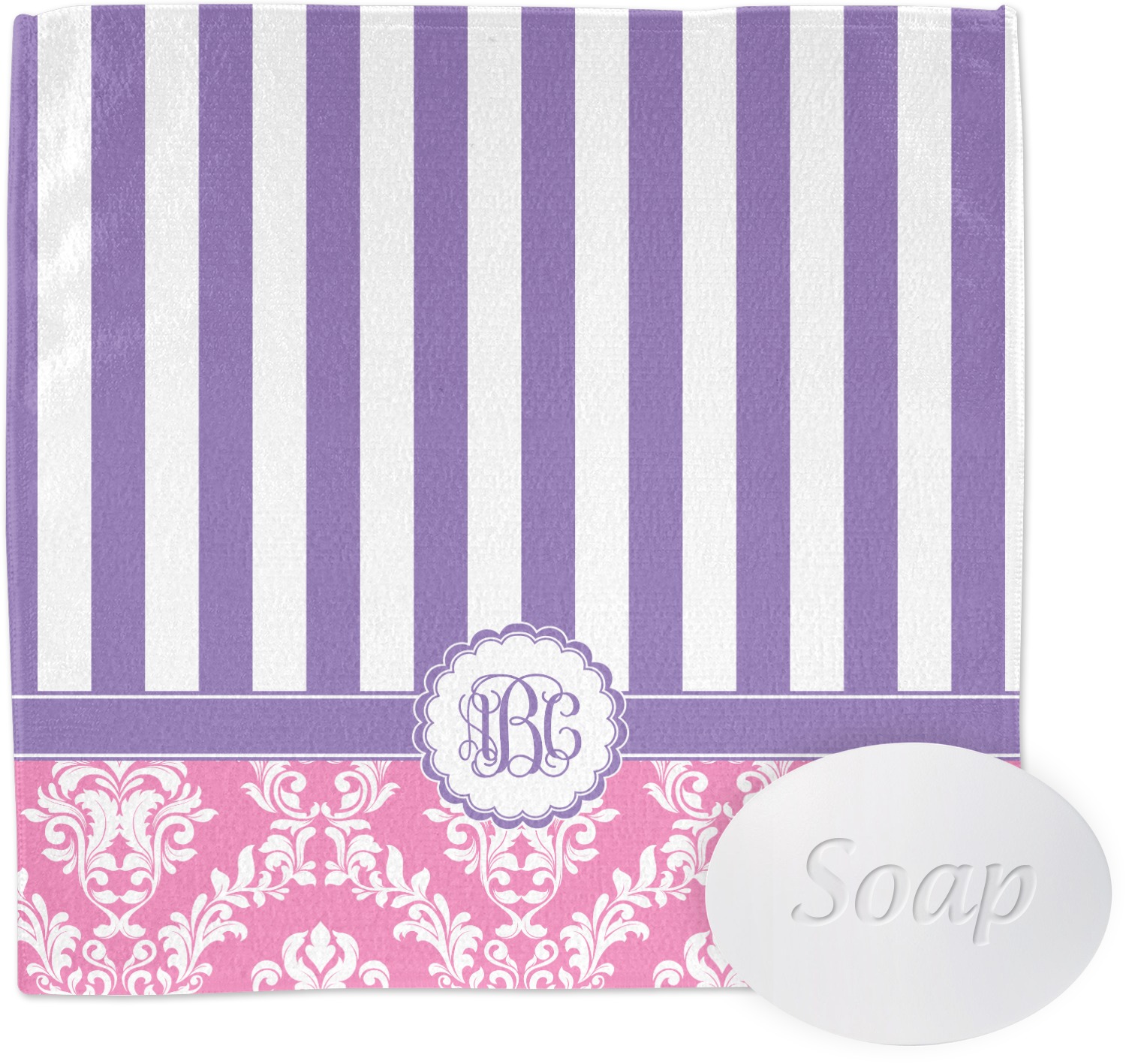 This stunning design is very feminine and elegant. It has simple, yet classic purple and white stripes on top with the stunningly elegant damask in pink and white on the bottom. The design is trimmed with a classic purple ribbon, along with a scalloped label and ever so beautiful interlocking monogram.