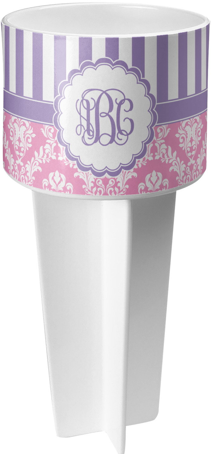 This stunning design is very feminine and elegant. It has simple, yet classic purple and white stripes on top with the stunningly elegant damask in pink and white on the bottom. The design is trimmed with a classic purple ribbon, along with a scalloped label and ever so beautiful interlocking monogram.