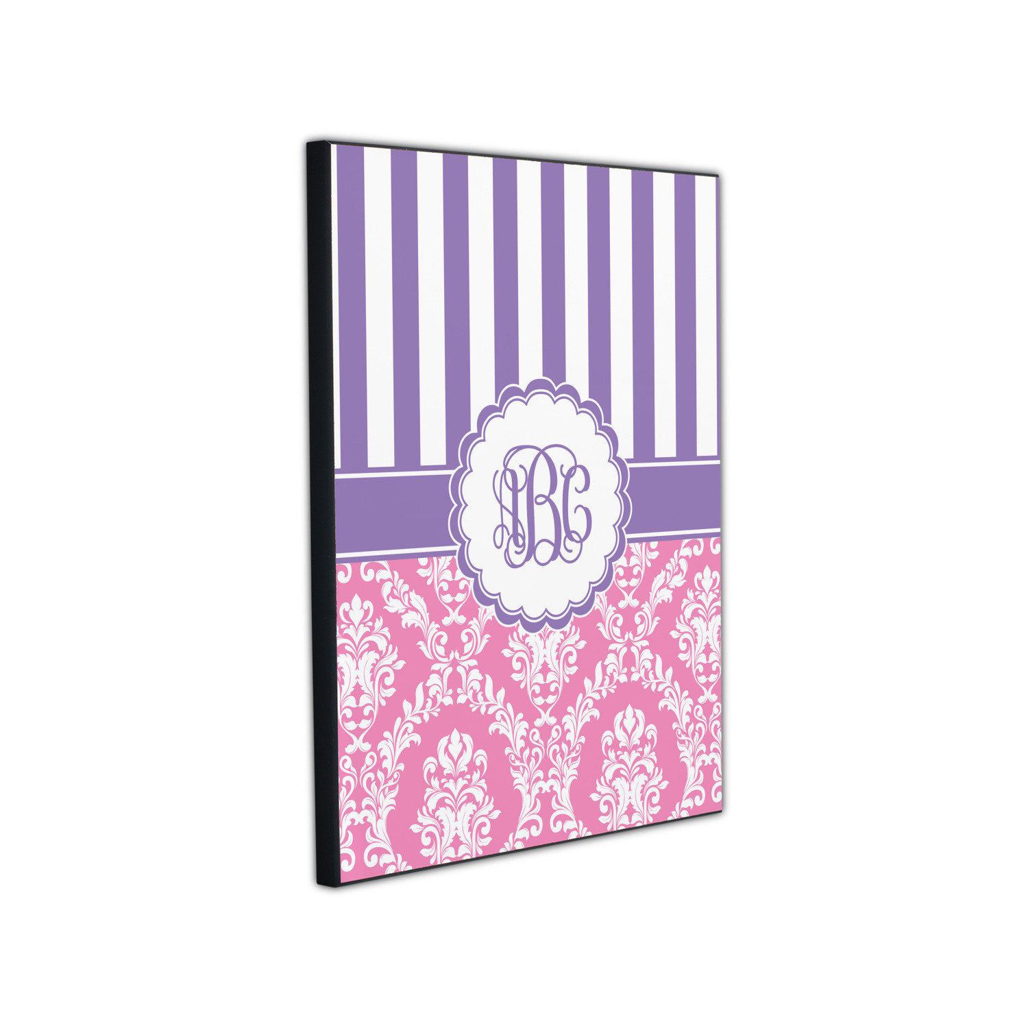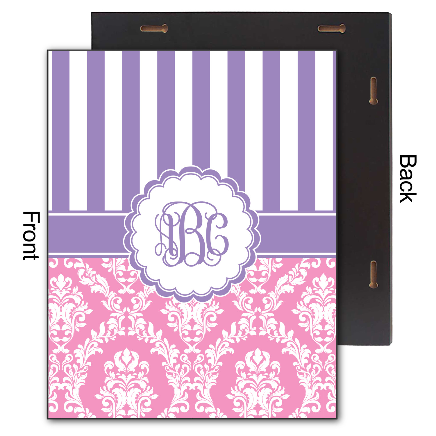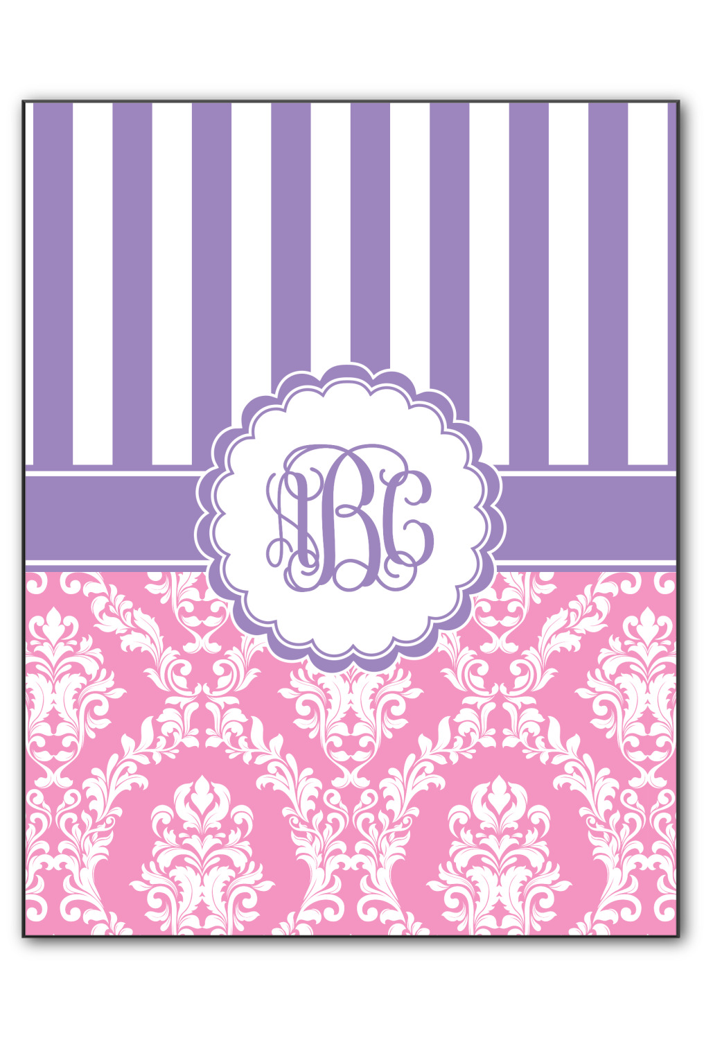 This stunning design is very feminine and elegant. It has simple, yet classic purple and white stripes on top with the stunningly elegant damask in pink and white on the bottom. The design is trimmed with a classic purple ribbon, along with a scalloped label and ever so beautiful interlocking monogram.