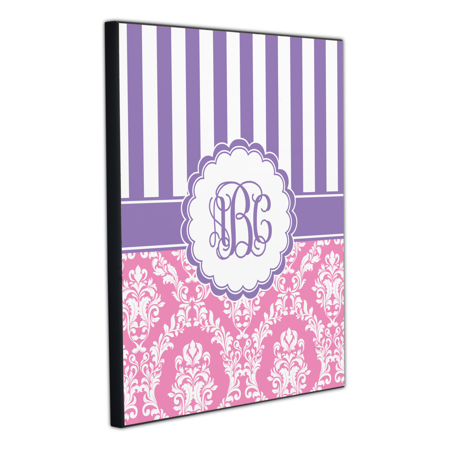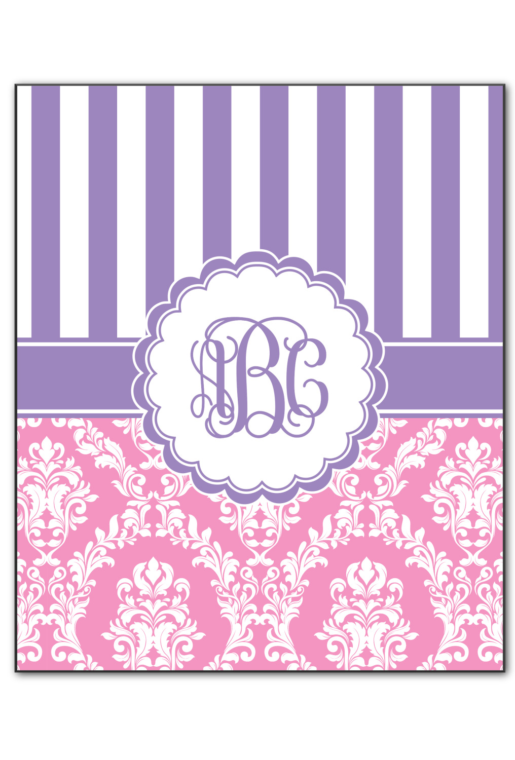 This stunning design is very feminine and elegant. It has simple, yet classic purple and white stripes on top with the stunningly elegant damask in pink and white on the bottom. The design is trimmed with a classic purple ribbon, along with a scalloped label and ever so beautiful interlocking monogram.