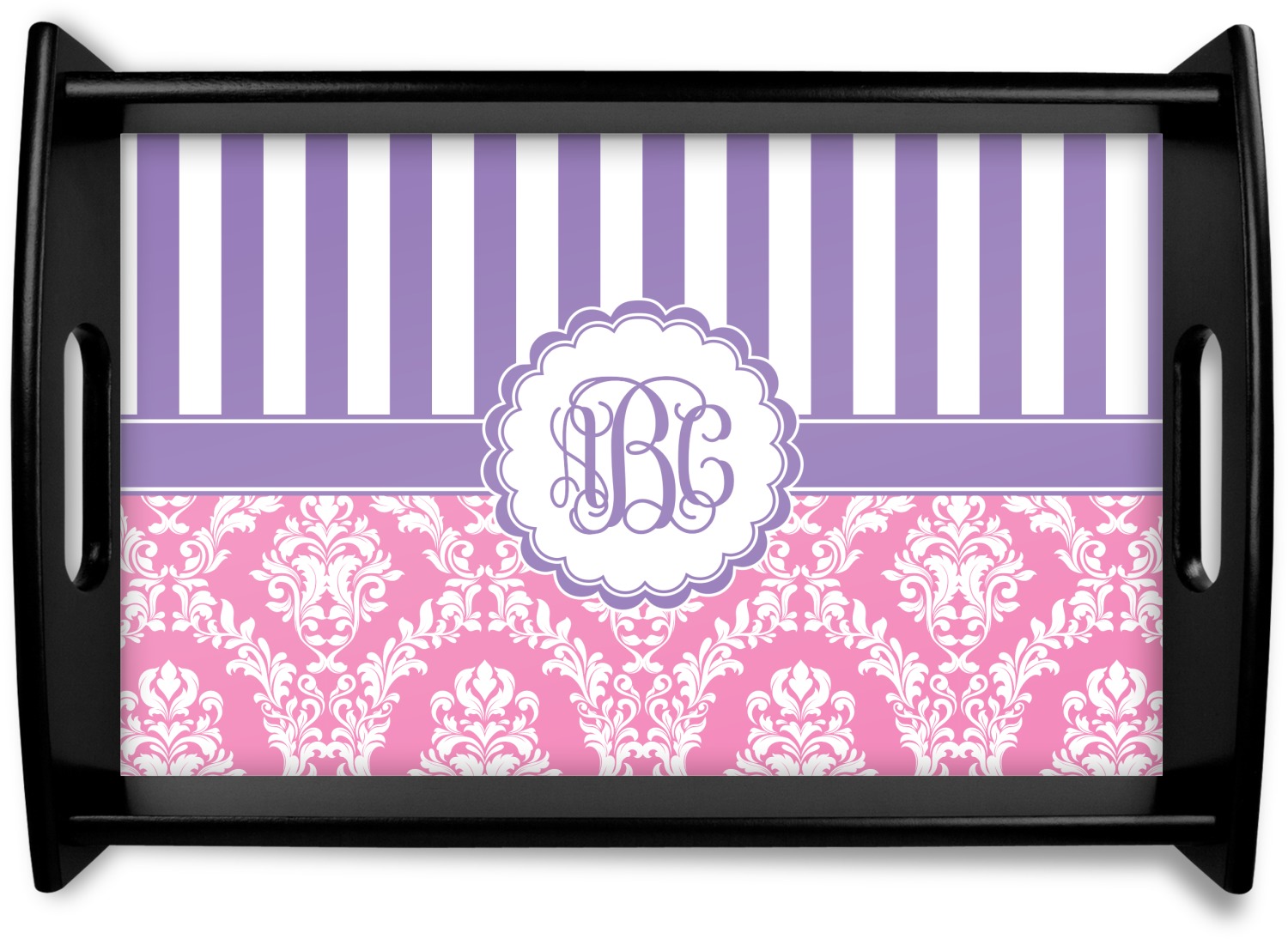 This stunning design is very feminine and elegant. It has simple, yet classic purple and white stripes on top with the stunningly elegant damask in pink and white on the bottom. The design is trimmed with a classic purple ribbon, along with a scalloped label and ever so beautiful interlocking monogram.