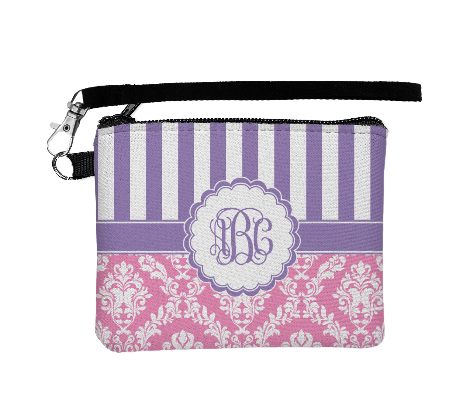 This stunning design is very feminine and elegant. It has simple, yet classic purple and white stripes on top with the stunningly elegant damask in pink and white on the bottom. The design is trimmed with a classic purple ribbon, along with a scalloped label and ever so beautiful interlocking monogram.