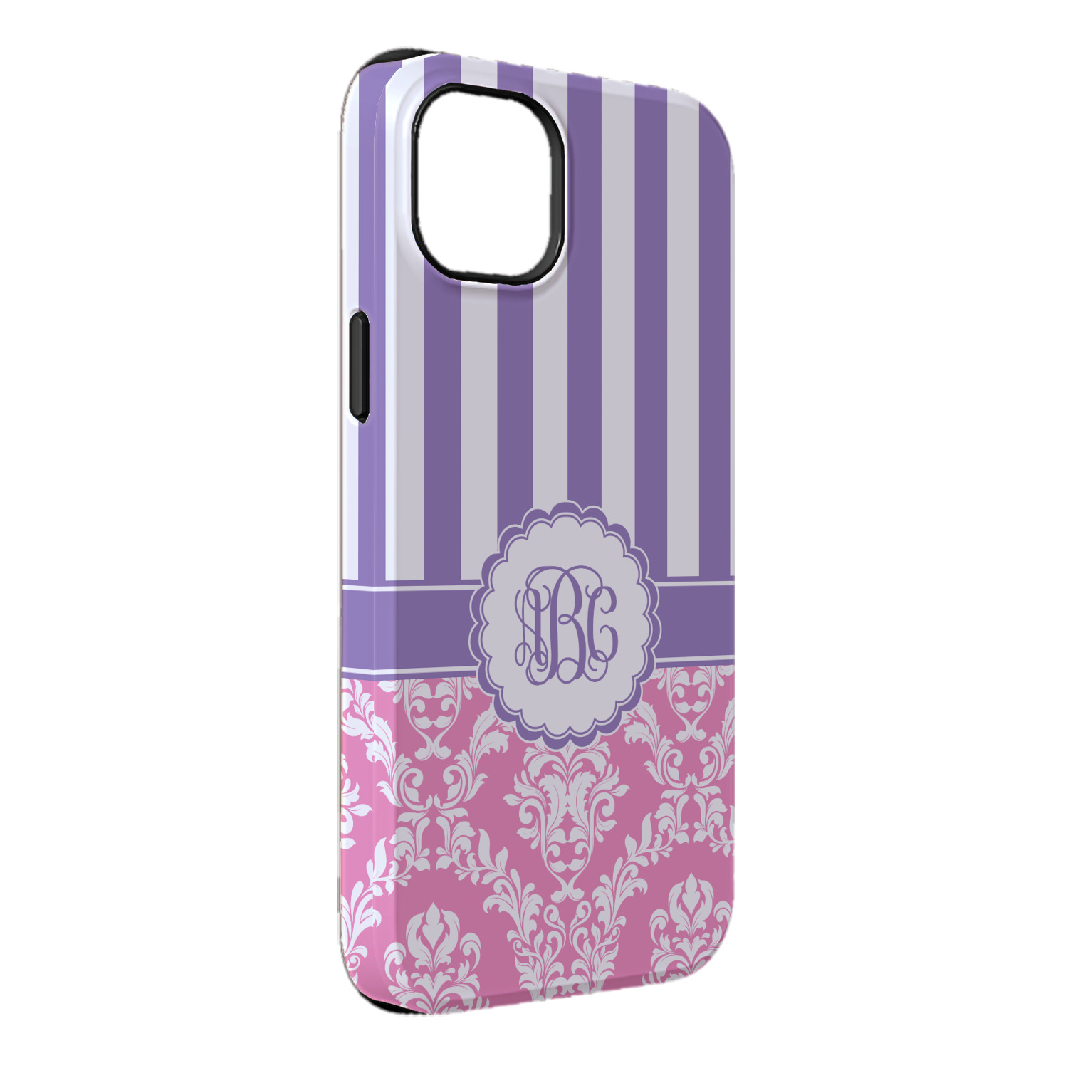 This stunning design is very feminine and elegant. It has simple, yet classic purple and white stripes on top with the stunningly elegant damask in pink and white on the bottom. The design is trimmed with a classic purple ribbon, along with a scalloped label and ever so beautiful interlocking monogram.