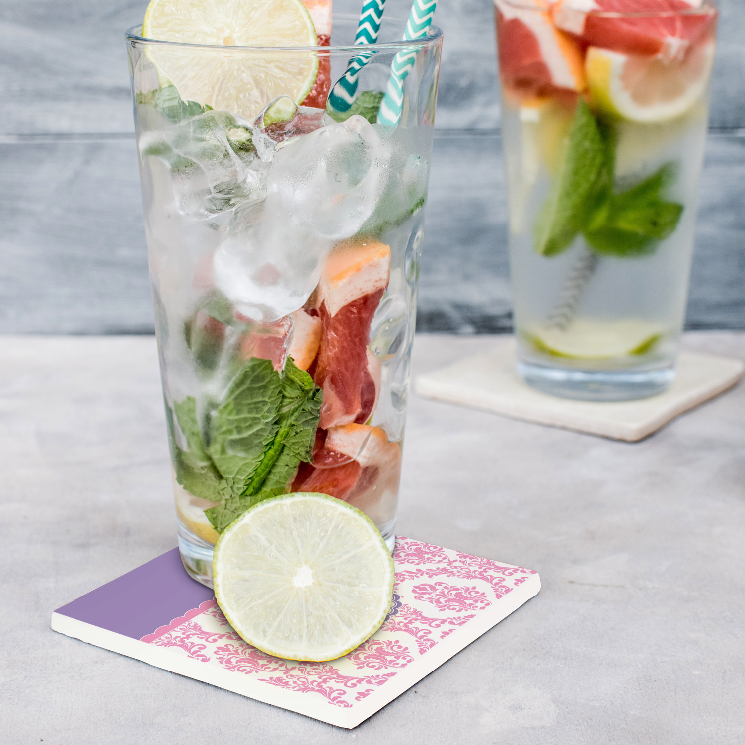 These customized stone coasters are perfect for use with beverages that are served in drinkware that "sweat". When cocktails, sodas, iced tea, water, etc. are served with ice in a regular glasses (non insulated glasses), they release condensation that drips down the outside of the glasses.