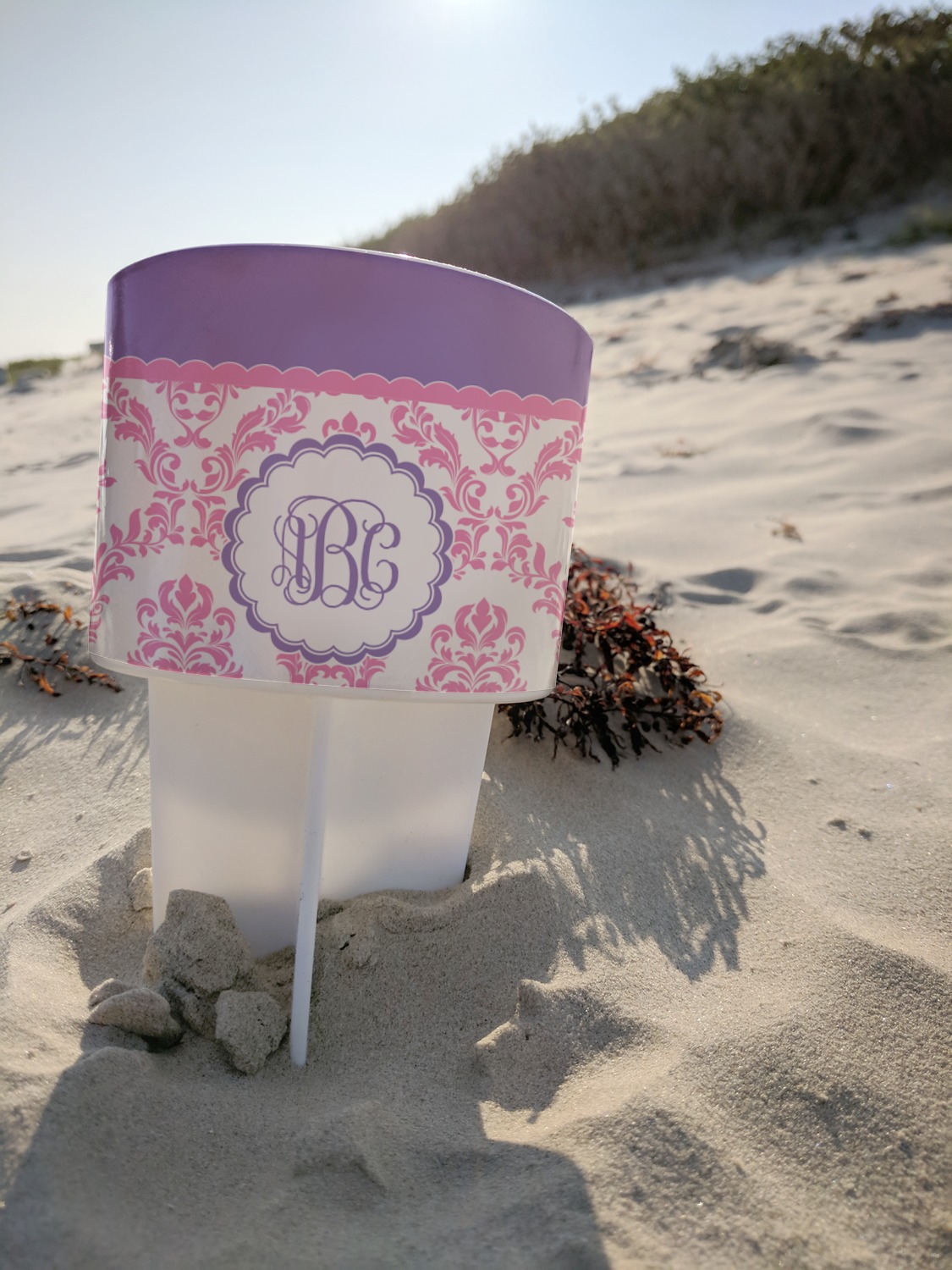 This cup holder has a large stake at its bottom that anchors it to the sand or ground below, while the cup holder rests above the stake. The entire drink holder is made of durable plastic and displays your customization around the cup holder portion. We sell these personalized beach spikers in two different colors: black and white.