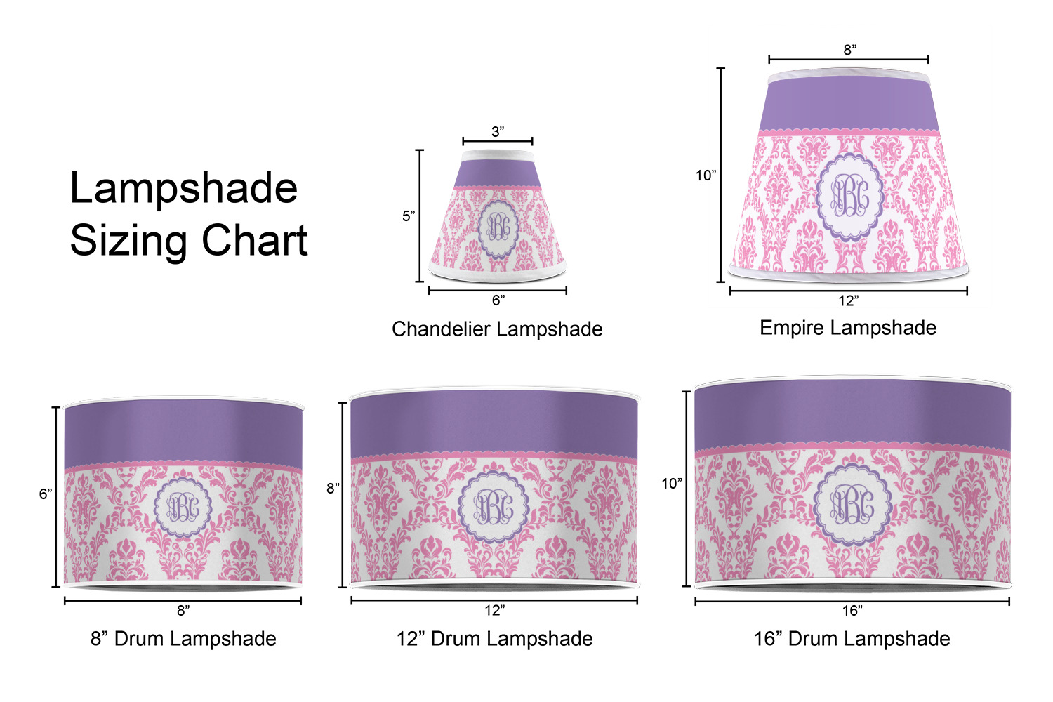 Our customized lamp shades also come in 3 different sizes: 8", 12" and 16", measuring at 8" in diameter by 6" tall, 12" in diameter by 8" tall, and 16" in diameter by 10" tall, respectively.