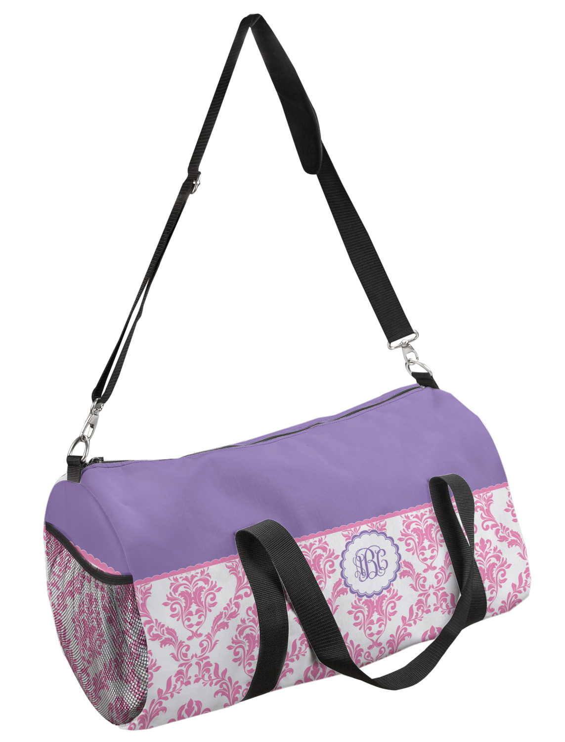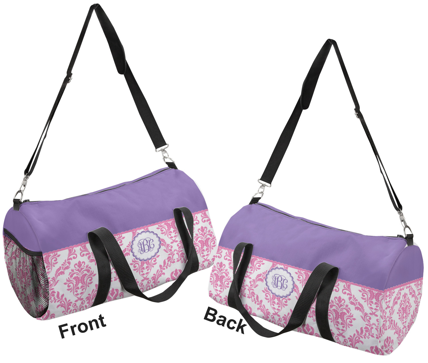 This duffle is a sturdy bag made of a canvas material. It comes in two sizes: Small (19"W x 9.5"H x 9.5"D) and Large (23"W x 12"H x 12"D). The bag is a cylindrical shape with a black adjustable strap and two handles. On one side is an elastic pouch to put a waterbottle or other small item. Your product will be sublimated with your design and is able to be designed on the front, back, and sides. Be sure to remember that the straps may cut into parts of your design if you upload your own artwork.