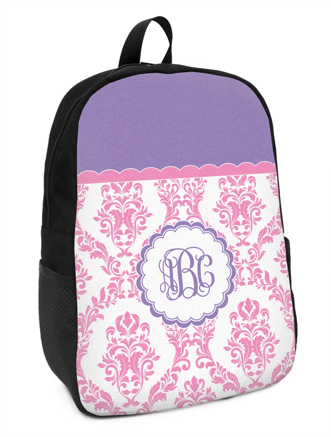 These small backpacks are made of a durable black canvas material with your personalization right on the front. The two shoulder straps are padded and easily adjustable. The bag itself measures at about 11" W x 15" H x 5" D. It's the perfect size for elementary aged kids or adults who want a smaller backpack. On the top of the bag you will find a handle to hang or carry your backpack by as well as a large zipper closure to keep all of your belongings safe inside. On each side of your backpack is a mesh pocket for a small item or water bottle. Inside your backpack you will find a spacious area with a small zipper pocket and a padded laptop slot that will fit up to a 13" laptop (13" being very snug). This is the perfect bag for any student that needs a couple books and their laptop with them at all times. It also works great as a carry on for traveling!