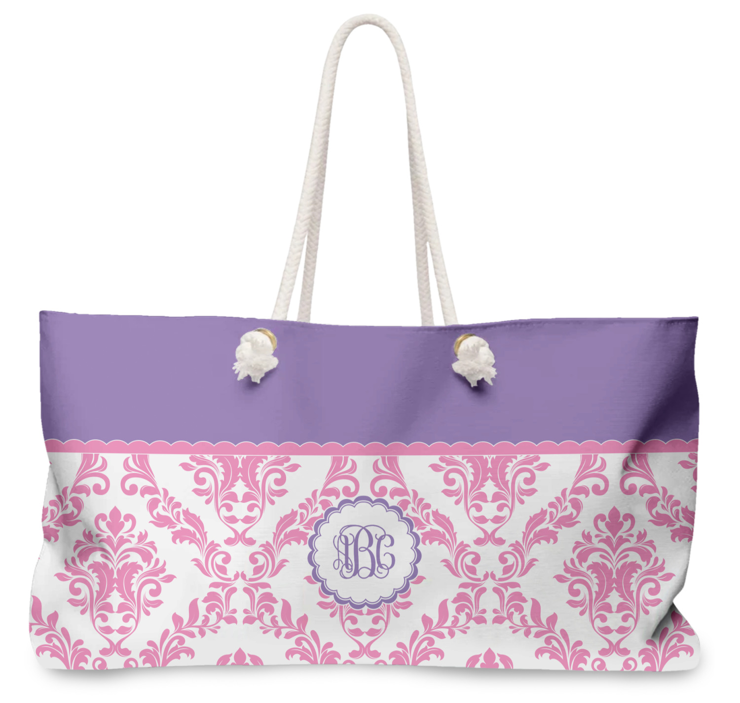 Our oversized weekender tote with rope handles is perfect for your weekend at the beach or on the town. This large tote are 24" W X 13" H, with a 5" gusset and a 27" thick rope handles with a knot that is put through a grommeted brass hole.