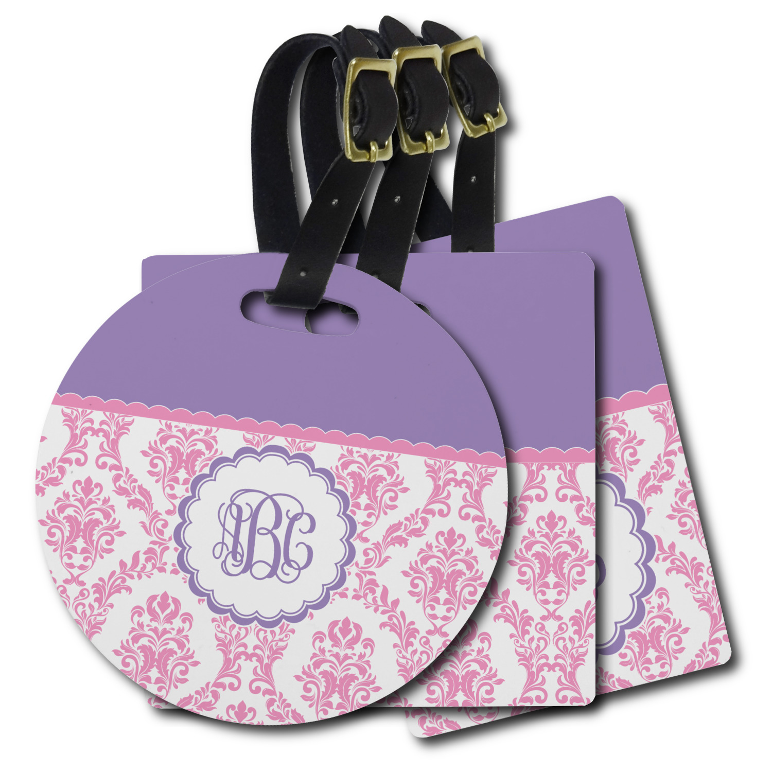 These personalized bag tags are sold in a variety of shapes, so that you may find the product that meets your vision exactly. We sell a round luggage tag, which measures at approximately 4" x 4". Our square luggage tag is about 3.5" x 3.5", while our rectangular version is 2.75" x 4 ".