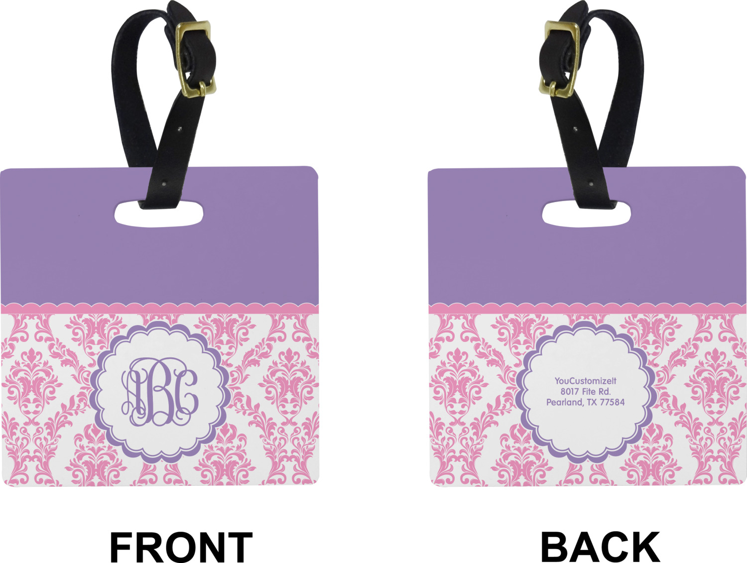 These personalized bag tags are sold in a variety of shapes, so that you may find the product that meets your vision exactly. We sell a round luggage tag, which measures at approximately 4" x 4". Our square luggage tag is about 3.5" x 3.5", while our rectangular version is 2.75" x 4 ".