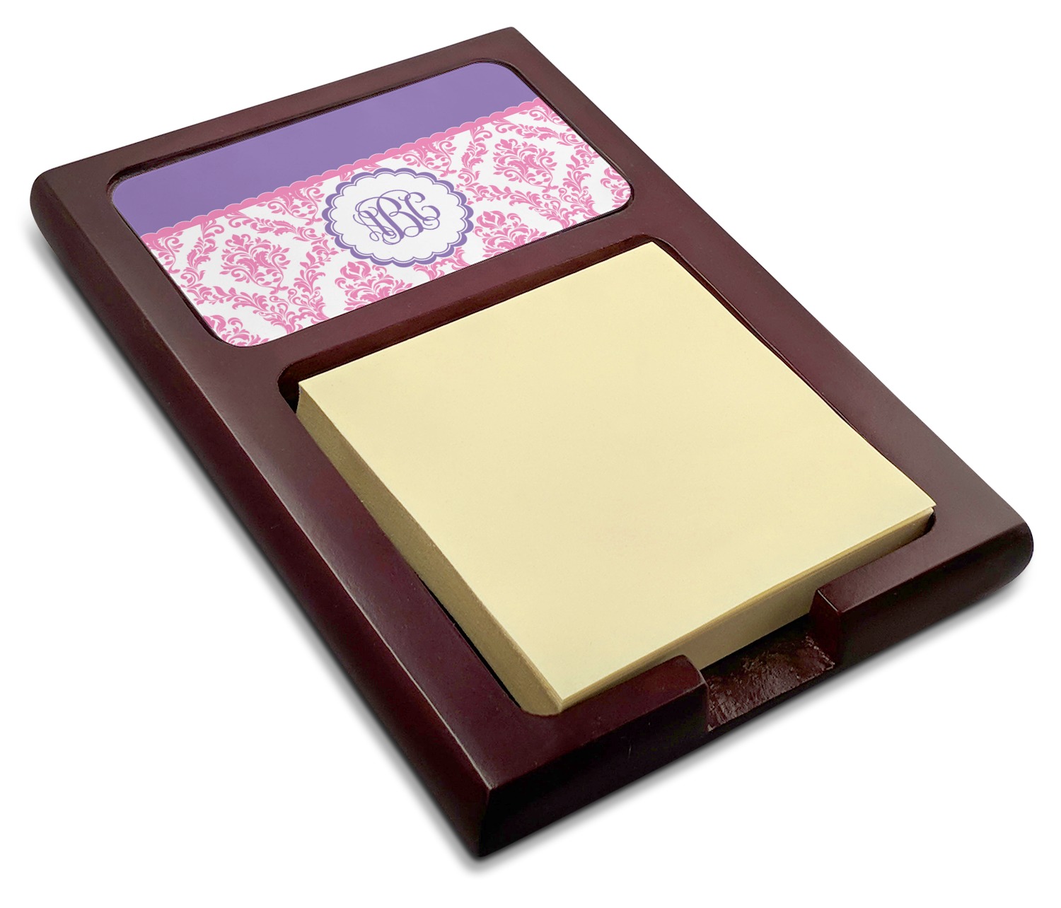Crafted from a fine mahogany, this post it note holder is in the shade of a dark, cherry color. The dispenser itself is about 4.25 by 6.25 by 0.75 inches. You can place your 3 by 3 inch sticky notes in the indentation below the nameplate. We print your customization onto the nameplate that rests above the velvety indentation.