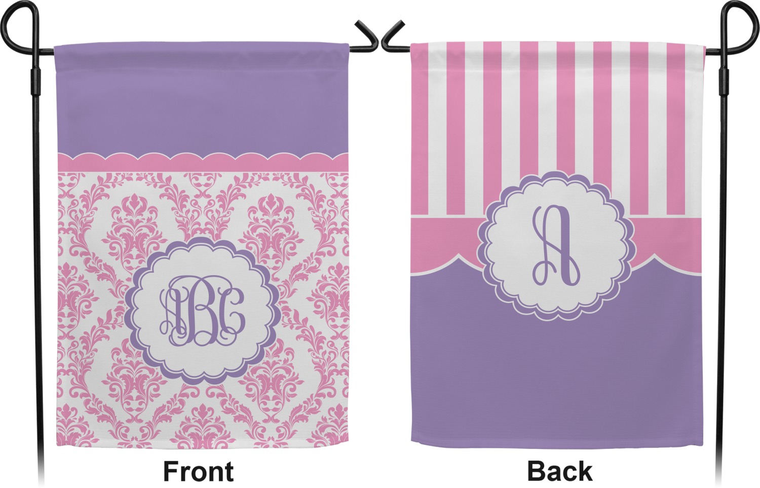 These custom garden flags are made of a durable, double-ply, polyester weave, allowing them to withstand the elements year round. The small flags measure at approximately 12 by 18 inches. The large flags measure out to 28 by 37 inches. You can order these decorative flags with your customization printed on the front only, or the front and back.