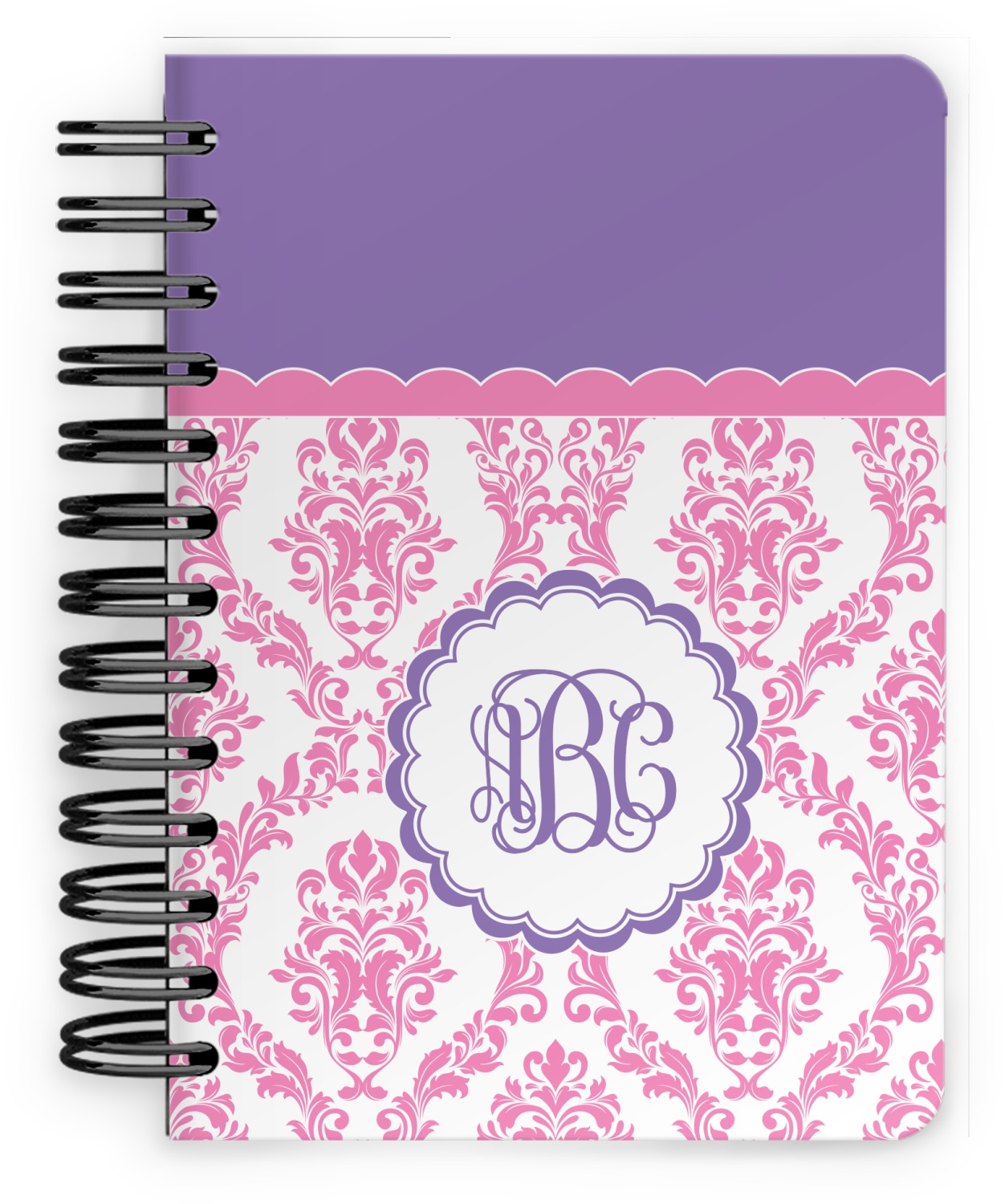 This spiral notebook includes 75 sheets of thick, ruled paper. The front and back of this custom notebook is made of a robust, laminate, plastic covering. We print your personalization on these two panels, underneath a glossy finish, which emphasizes the colors of your design. The two panels and the sheets of paper are held together by a sturdy, black coil. The paper within your bound notebook is perforated for easy, clean tearing.