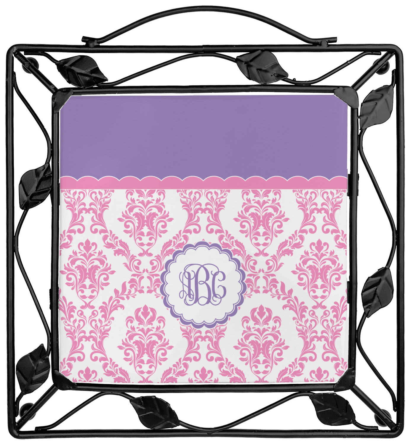 Our square trivets are made from a durable, wrought iron. This model features 4 small half circles, one on each corner, and a larger ring of iron that circles the central, customized tile. Each of the 4 corners has a round foot on its bottom for stability. This trivet is 8.75 by 8.75 inches, but the central tile measures at 6 inches on both sides.