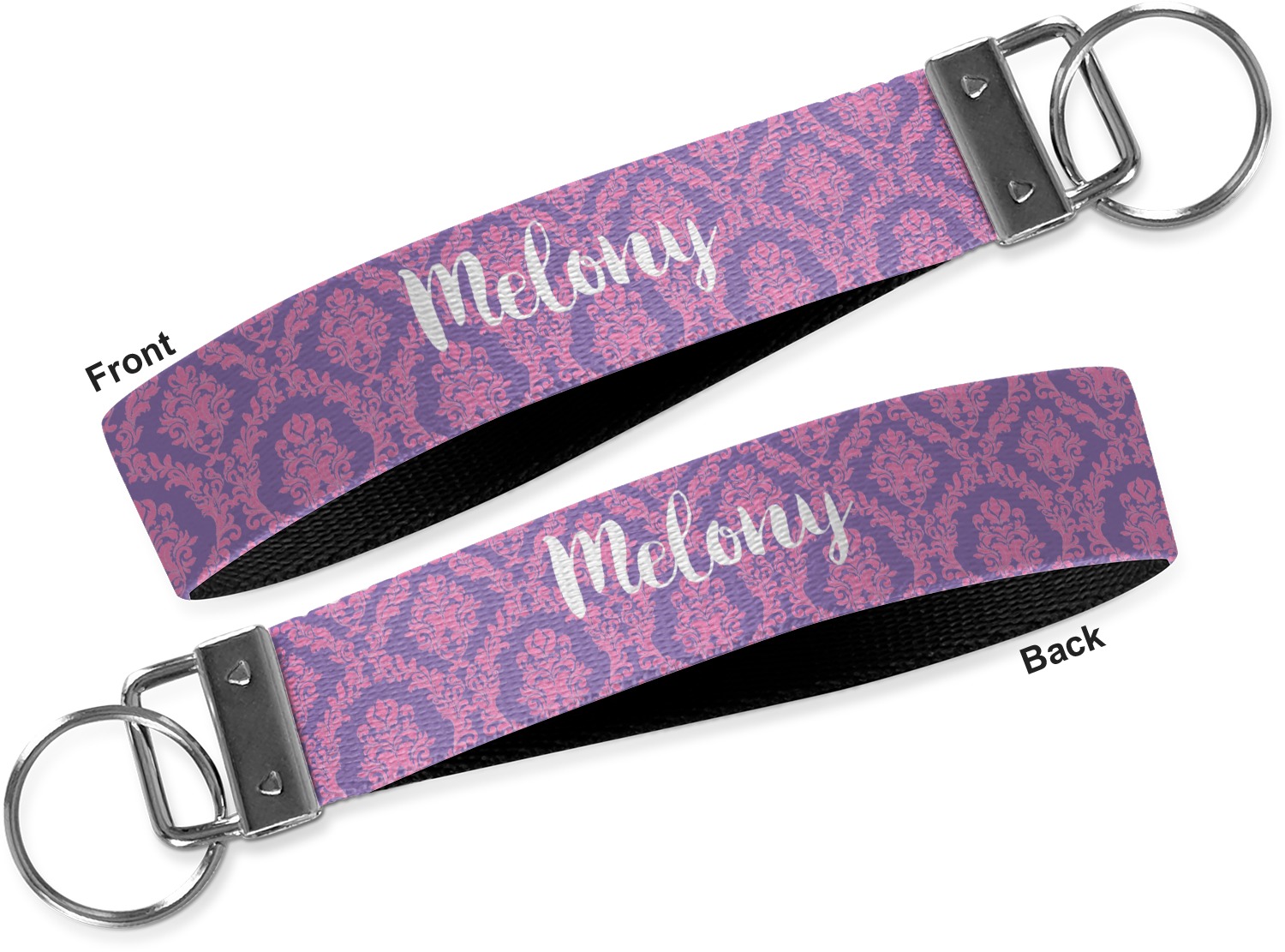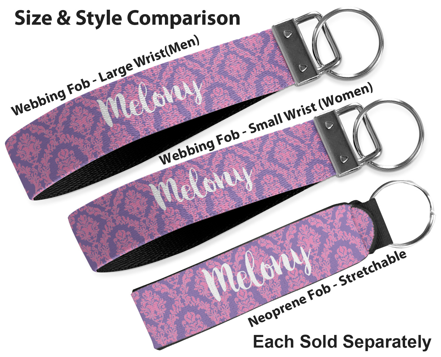 These key fob keychains are made from a polyester weave, right here in the USA. They feature a silver, metal clasp, attached to a round keyring. The piece gives the personalized wristlet a beautiful, finished look. Your customized design is printed on the outside of the keychain strap. We carry these wristlets in two sizes: small, which is 5 inches in width, and large, which is 5.5 inches in width.