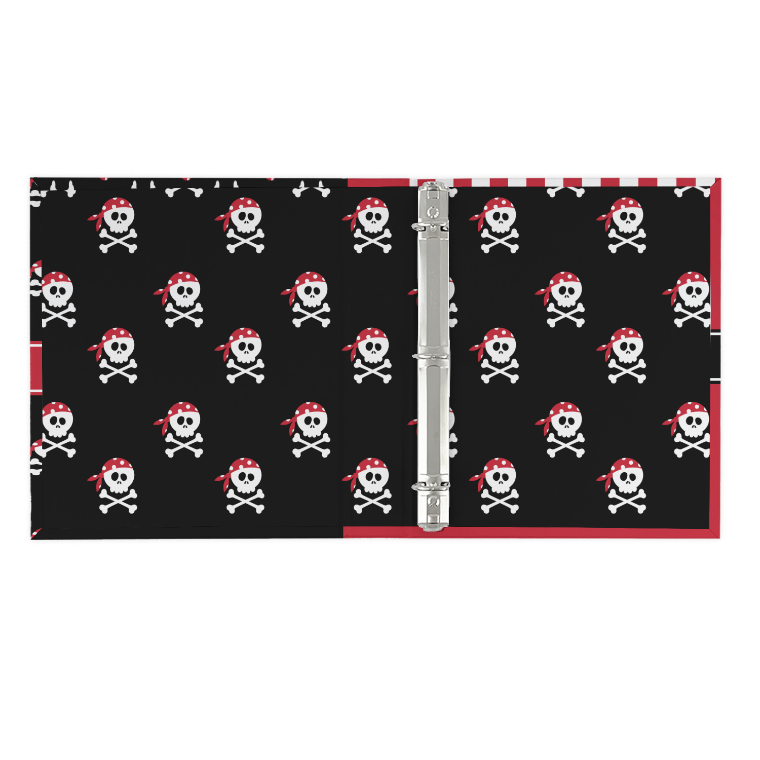 Pillage and plunder is the name of the game with this pirate design. Set on a backdrop of black, the skull and crossbones, sporting red and white polka dot dew rags, are the showcase in this design. A wide band of red trimmed in white bring these classic colors together.
