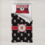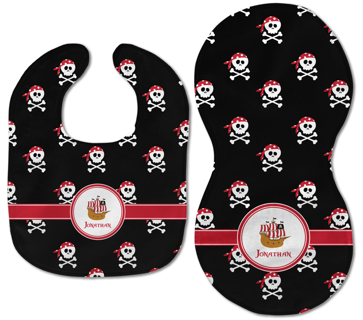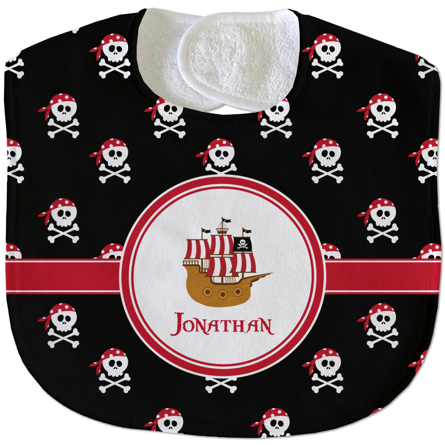 Pillage and plunder is the name of the game with this pirate design. Set on a backdrop of black, the skull and crossbones, sporting red and white polka dot dew rags, are the showcase in this design. A wide band of red trimmed in white bring these classic colors together.