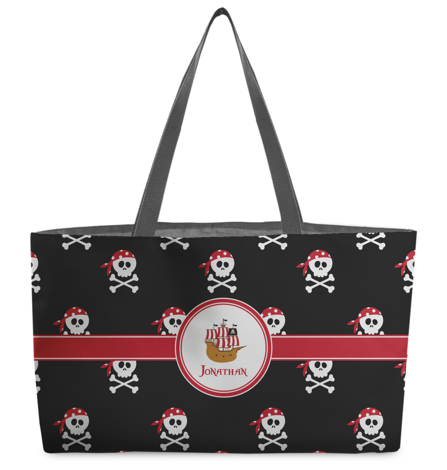 These beach totes are handmade here in the USA. Fabric is printed with your design. The tote is then sewn from the fabric pieces, lining and handles added.