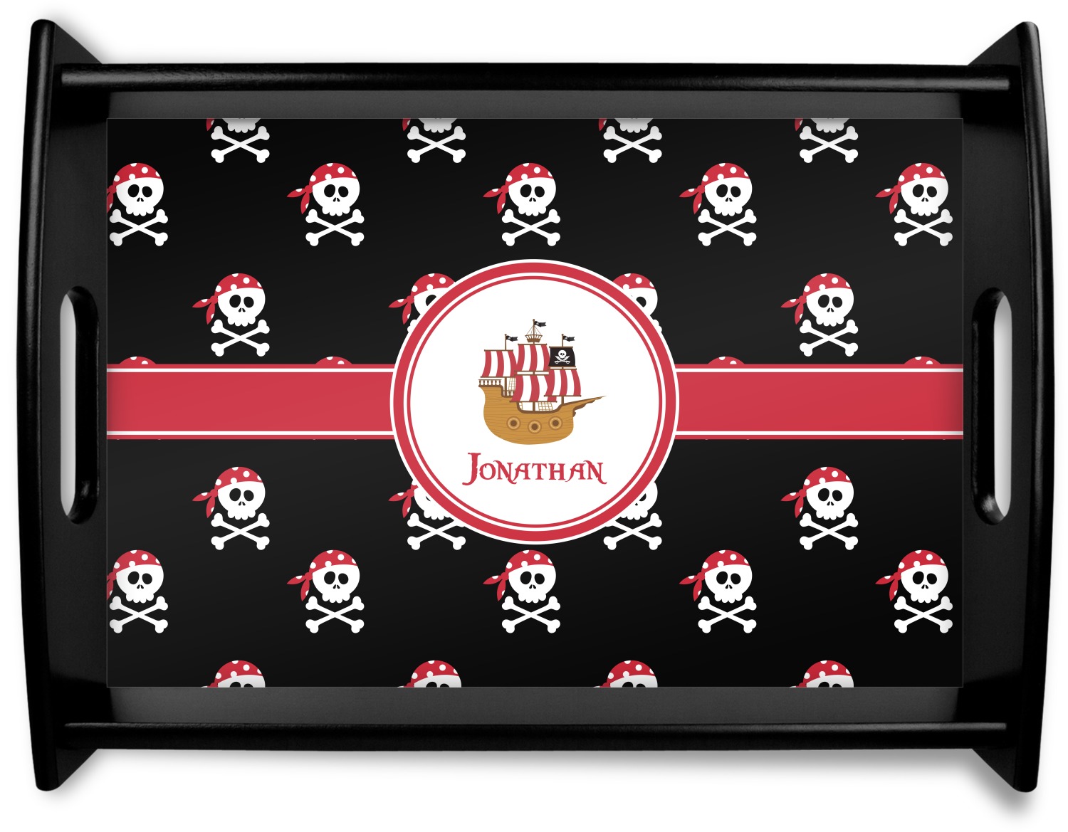 This serving tray with handles features square edges and two rounded sides, creating a very modern look. Each side is fabricated from a beautifully cut, natural wood. The bottom of the interior of the tray displays your customized design in bright, vibrant color. The tray is sold in both a black color and a natural wood look. Each variation of the wood serving tray has two sizes: Small, which is 14" x 10" x 2.25", and Large, which is 19.5" x 13.5" x 2.75".