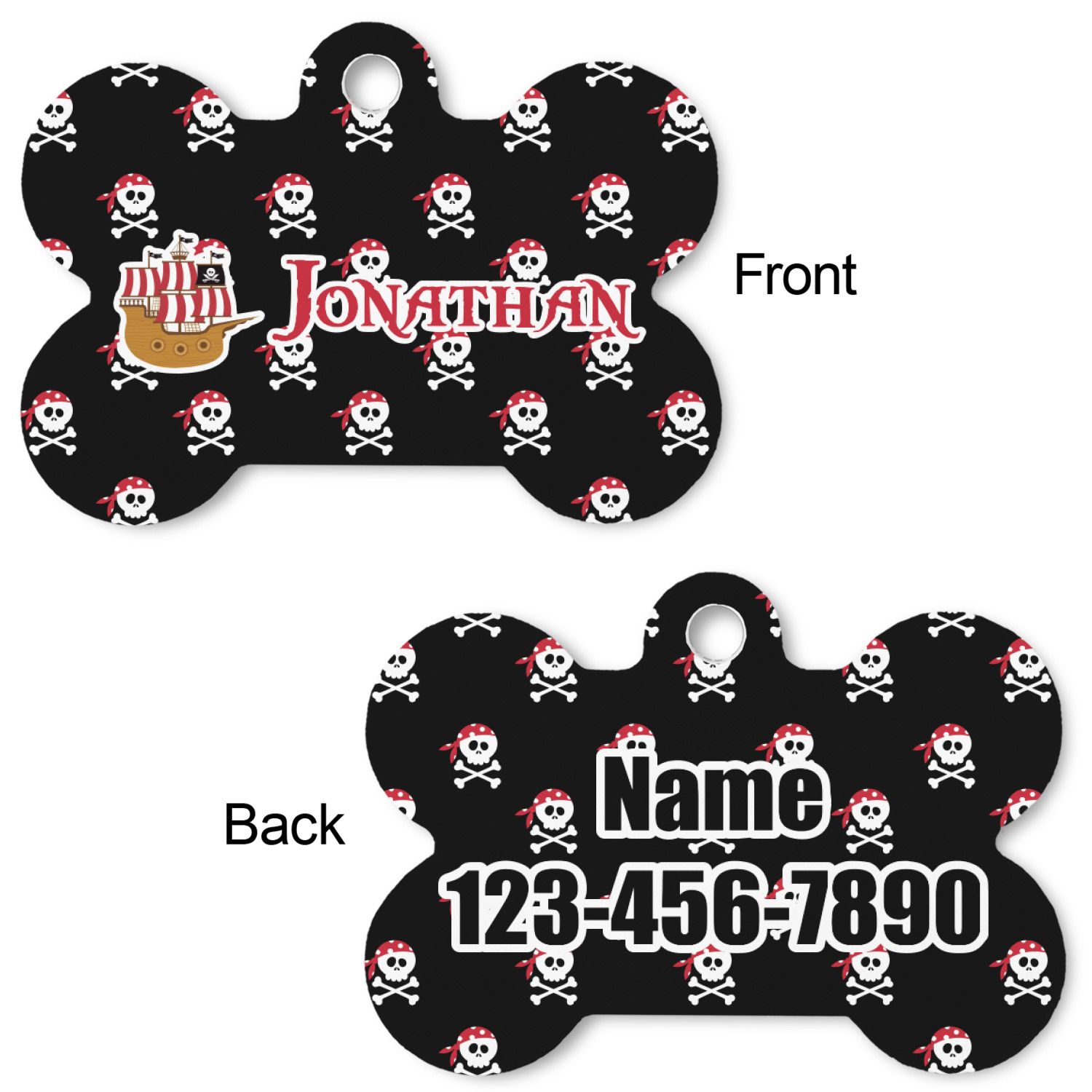 Our default design templates print your dog's personalization on the front and your contact information on the back; however everything is customizable, so you customize the patterns, the colors, the personalization, the contact information etc.