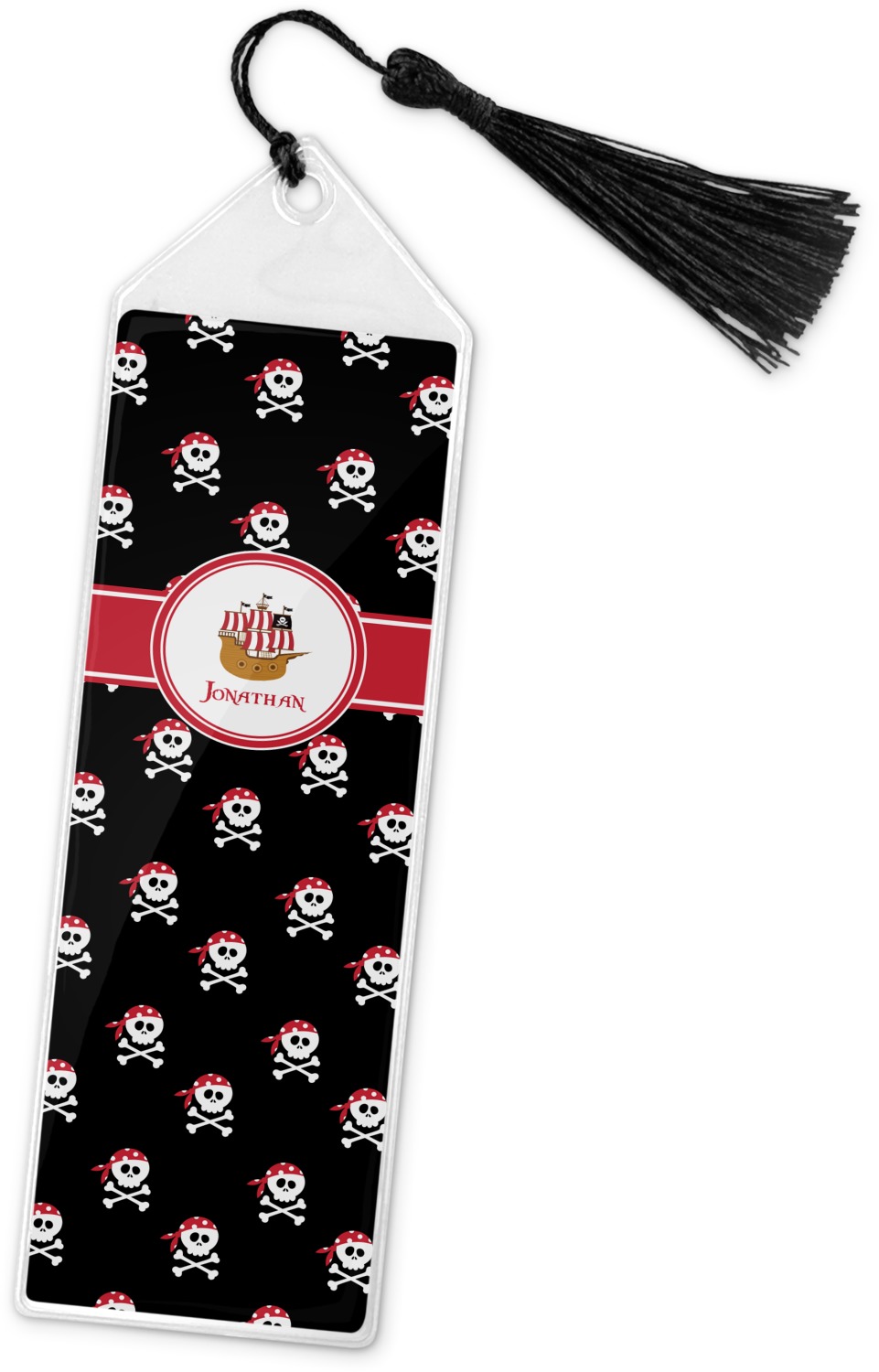 Your personalized bookmark is made of a sturdy, clear vinyl, and is approximately 7.5" x 2.25". We display your personalization on vinyl inserts that are placed on both sides. Accompanying each book marker is a black, fringe tassel that attaches to the reinforced, triangular header.